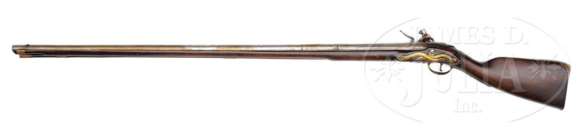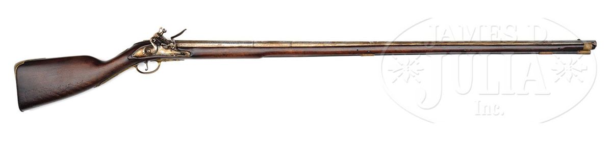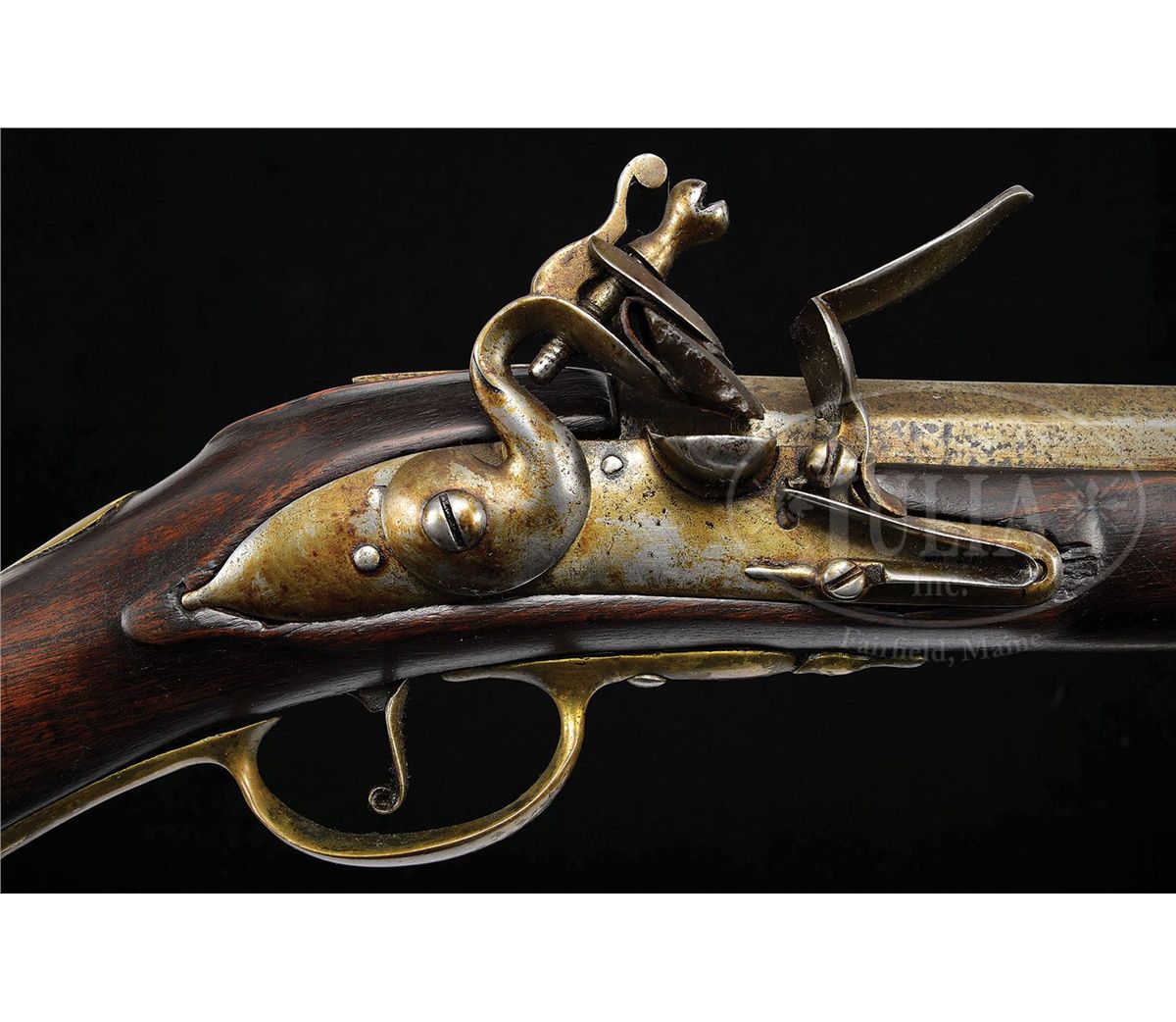 NSN. .80 Cal. X 45-5/8" long 3-step bbl. Colonial Musket of club-butt configuration. First stage oct, second stage rnd and separated by a third rnd stage by baluster rings. Having a front sight set back 1-1/2" from the muzzle. European lock is 6-1/4" long unbridled and orig flint. No proof marks are noted on this bbl. Brass furniture consists of nose band, 2 rammer pipes, 10" long trigger guard, short 3-step butt tang, serpentine side plate showing 3 screws in a tear drop shaped escutcheon plate nailed to the wrist with two brass nails and marked with an "&". 60-1/2" long European club-butted stock.Has a pointed raised carving behind the bbl tang. PROVENANCE: Collection of Dr. Douglas Sirkin. CONDITION: Iron lock and bbl have been cleaned at one time still showing evidence of pitting. Walnut stock appears to have had some light refinishing and minor repairs next to the bbl tang. Lower buttstock has numerous nicks, dings, and worm hole damage, not affecting overall appearance of the gun. 4-49776 PAS15