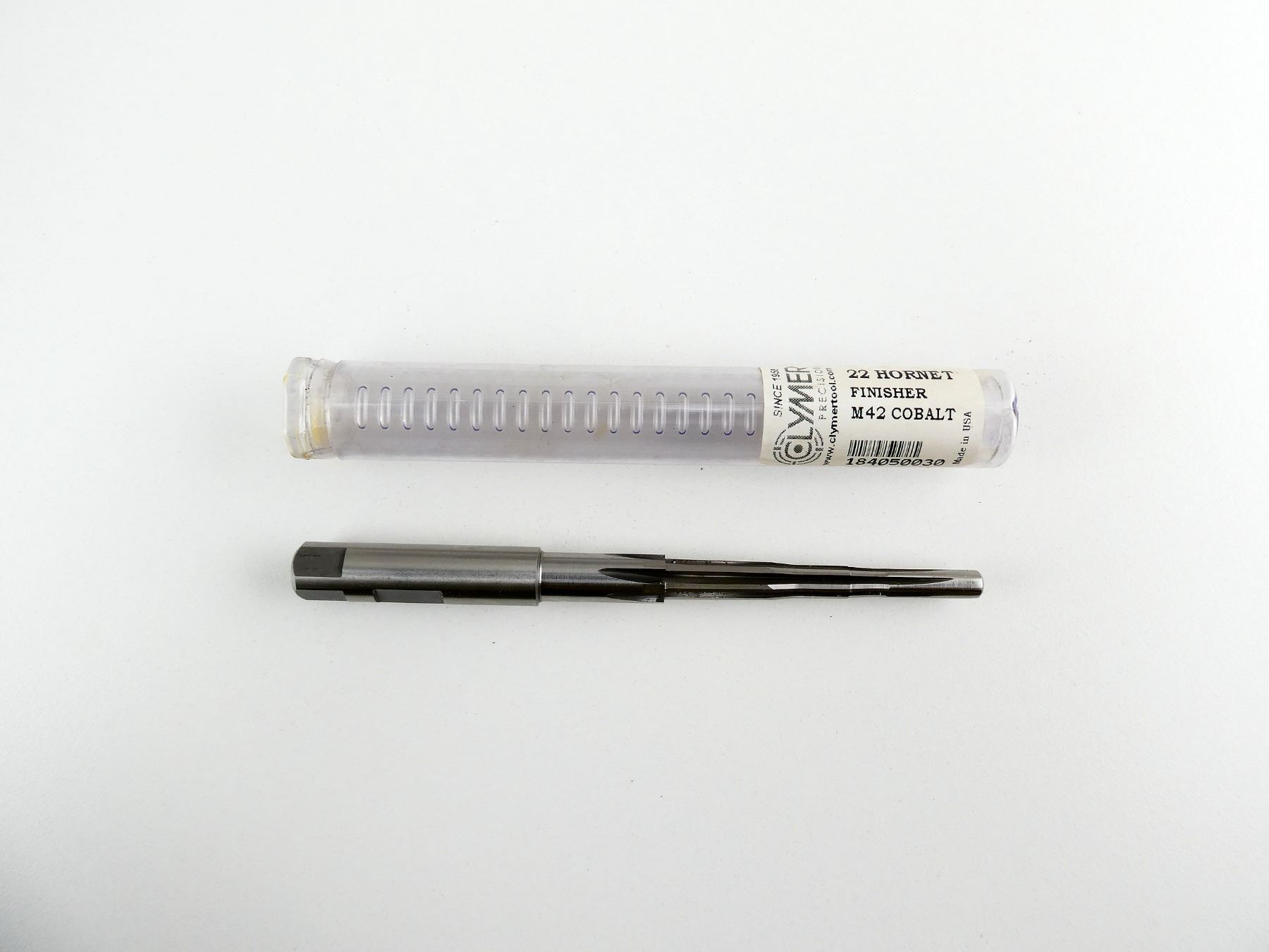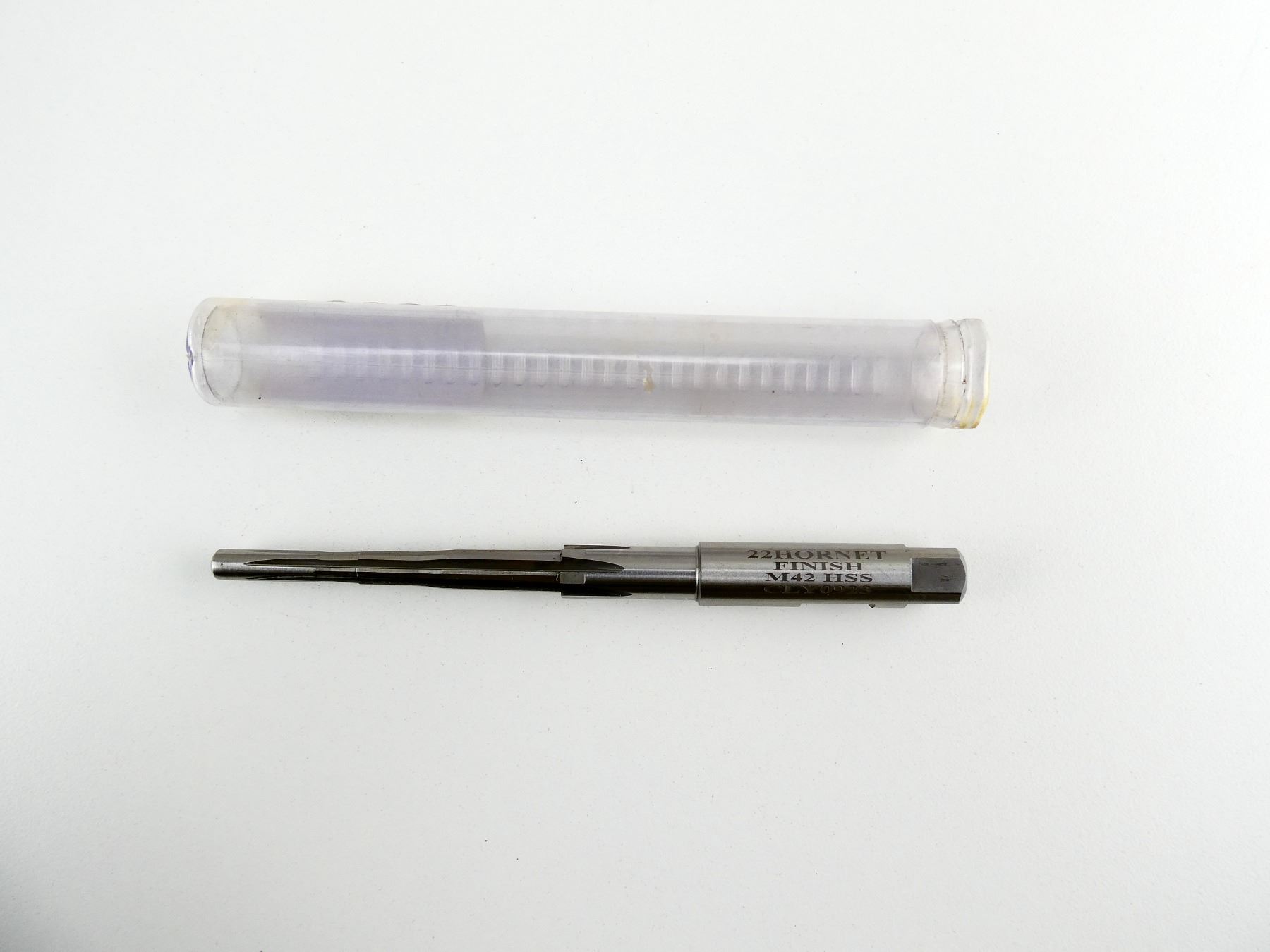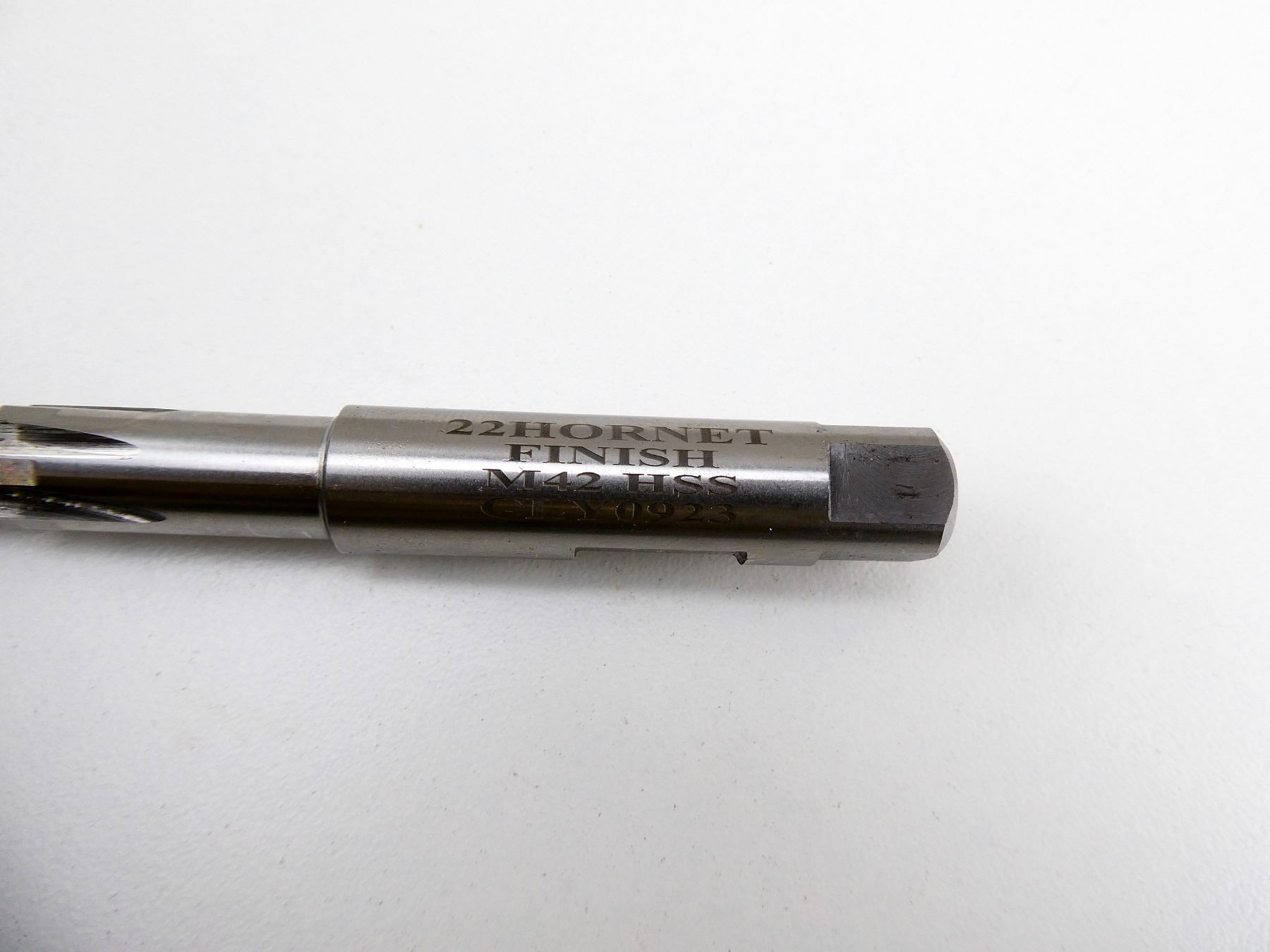(1) METAL .22 HORNET REAMER, MARKED: "CLY 0923", SHOWS LIGHT WEAR / TEAR, OAL APPROX. 5". MAY REQUIRE FITTING. SEE PHOTOS.