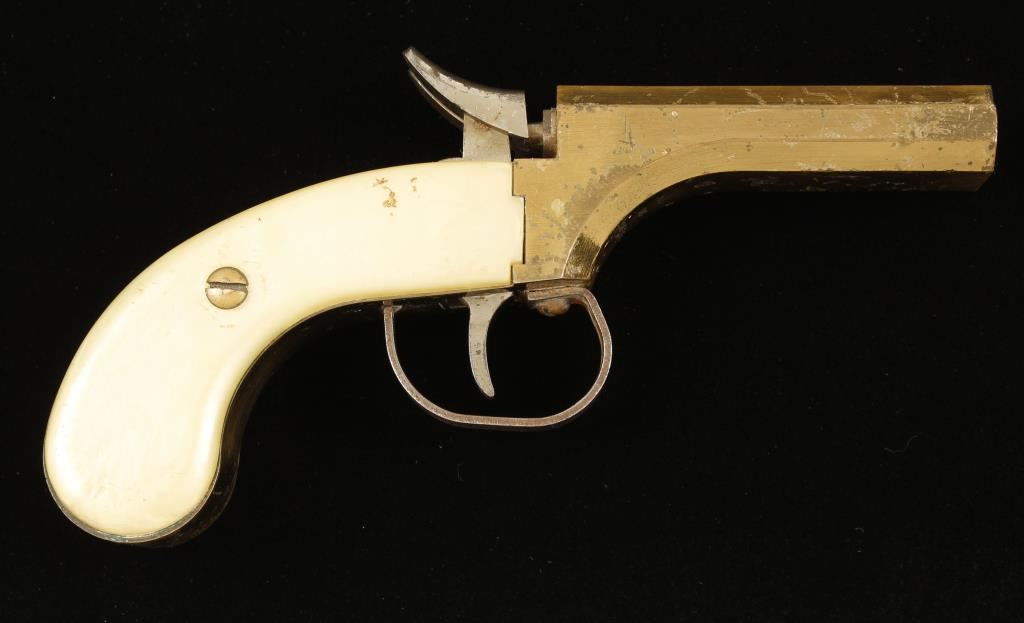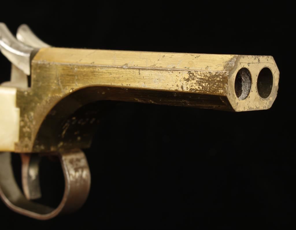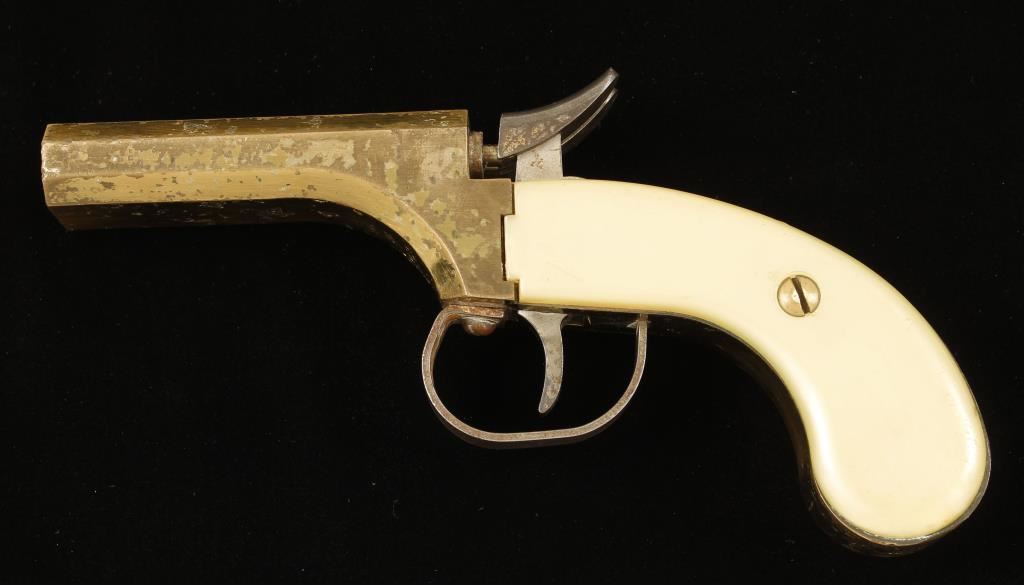 Double barreled percussion pistol with 2-3/4" barrels. Double hammers and one trigger. Brass with bright plated brass over it and white plastic grips. Plating is flaking off. Grips are scratched. Action works well. Condition is fair.