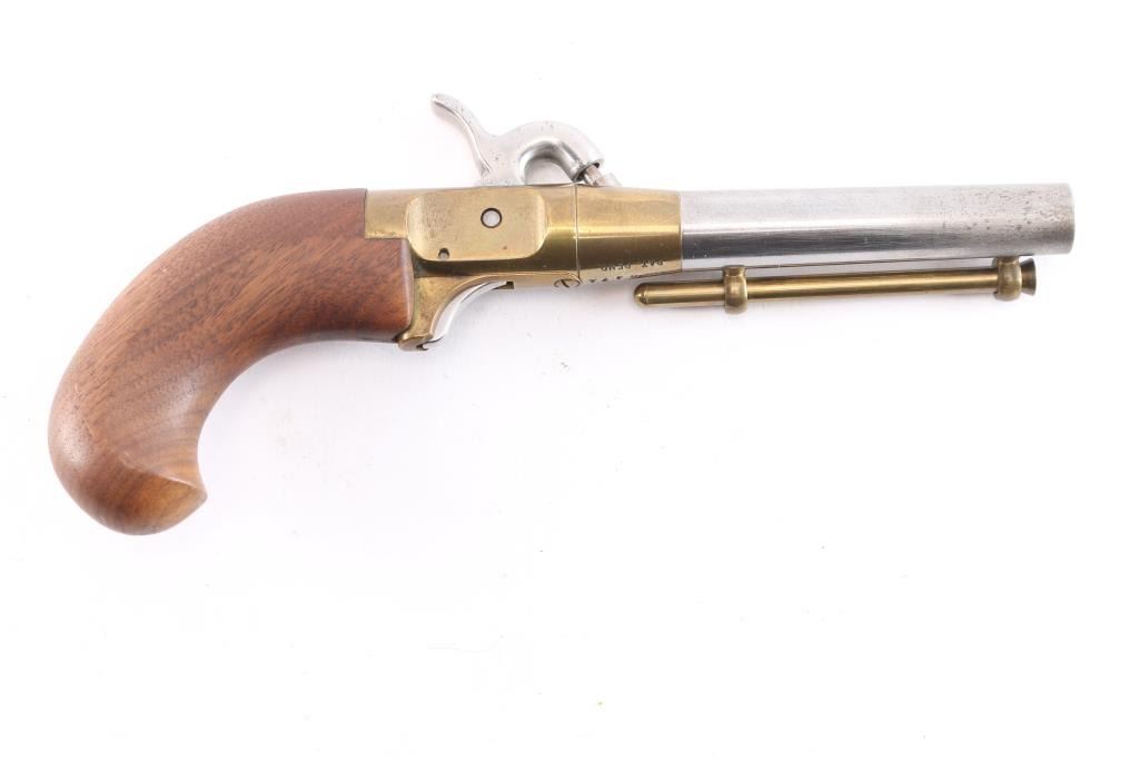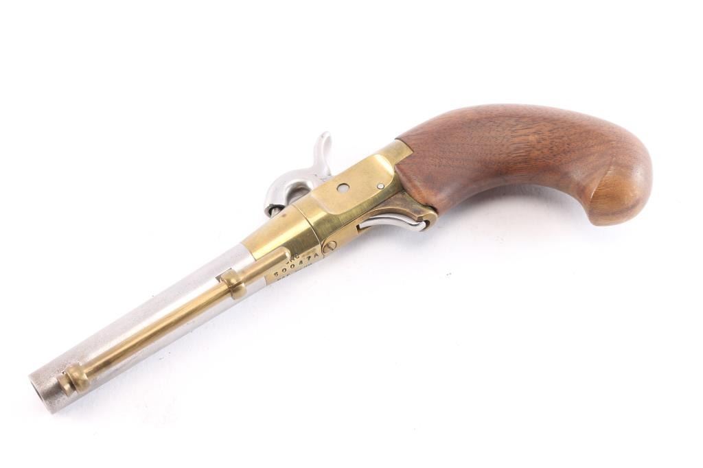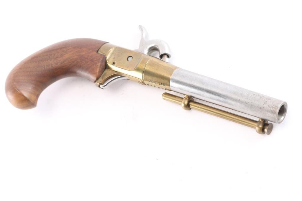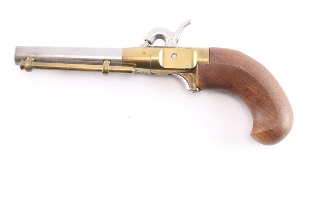 Single shot black powder pistol of the type sometimes referred to as a "Boot Pistol". Features 4.5" smooth bored barrel, ramrod under barrel held by ferrules, no sights, spur trigger, hammer on top at center, single piece wood grip. Barrel, trigger, hammer, nipple, screws are steel, in the white. Other metal parts are brass. Bore appears bright, unfired. Exposed surfaces are clean and smooth with some scuffing, slight discoloration to brass parts. Grip is very good. Action works well