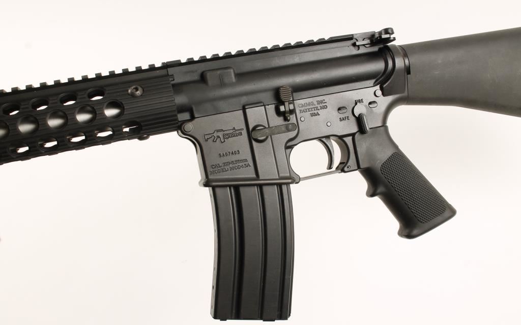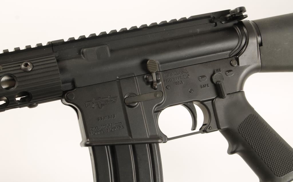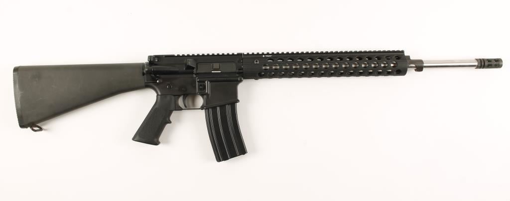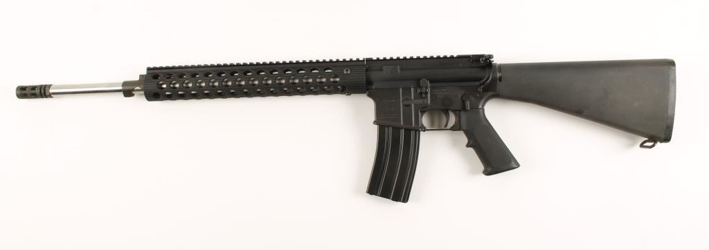 Semi auto version of an AR15 assault rifle with a 20" bull barrel and flat-top picatinny rail from cocking handle to gas check. Fore end is perforated anodized aluminum. Bore is immaculate. Forward assist. Includes 1 mag. Condition is excellent. *Modern Firearm*