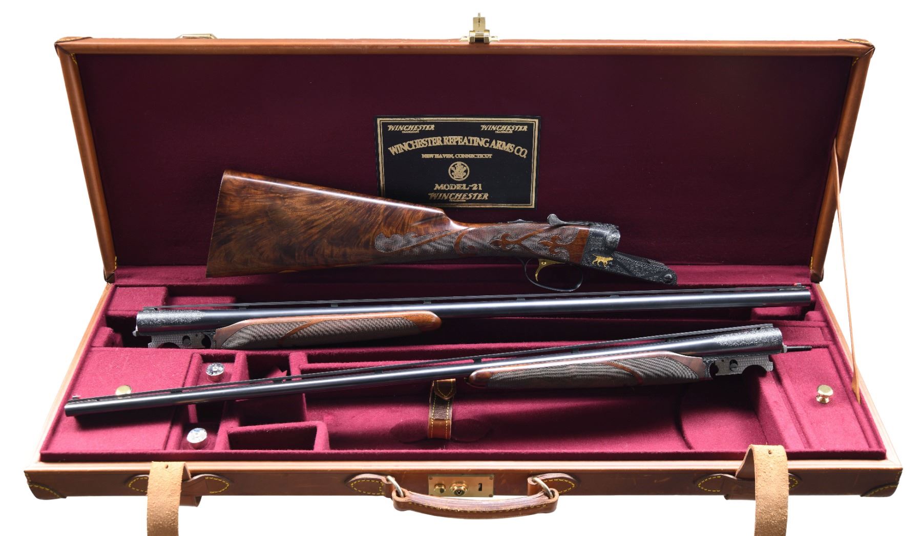 BARREL SET WITH CASE. Cal. 410 3"/ 20ga 2 3/4". S# W38111. Two sets of 28" bbls fitted w/ raised matted vent ribs have 3 1/2" triangles of scroll engraving at breech ends. Bbl flats are engine turned. Flats of 410 bbls are milled out to reduce weight. Both flats are stamped w/ S#, gauge, and chamber information. Both bbl sets are marked "WINCHESTER PROOF STEEL" & w/ choke markings, "WS1" and "WS2". Loops are stamped "1" on 20 Ga. set & "2" on .410. Maker's name & address is at base on both loops. Blued flat side boxlock Model 21 action features automatic safety & gold plated single selective trigger. Water table is milled out to reduce weight. Breech face is engine turned. Action is engraved in usual Model 21 Grand American style w/ near full coverage, varying size scroll w/ in feather borders. Scroll surrounds oval scenes of flush gold inlaid bird dogs on sides w/ an alert setter on left, & pointing pointer on right. Trigger plate, also scroll engraved, has circular vignette of a pair of gold pheasant standing on ground. Portrait of a dog is inlayed on trigger guard bow. Fences are deeply relief carved in usual Grand American oak leaf & acorn style. Straight grip buttstock of very fine crotch figured American walnut measures 14 3/8" over checkered wood butt. Stock is 21-B carved w/ fleur de lis intrusions & ribbons through pattern. A vacant gold oval is on toeline. Each bbl set has its own dedicated braced beavertail ejector forend w/ inlet ebony tip, engine turned internals (marked "1" and "2") & usual Model 21 J spring & knurled button release. DAH: 2 1/4". DAC: 1 7/16". WEIGHT: 20ga - 6 lbs. 12 oz. and .410 - 7 lbs. 4 oz. UNATTACHED ACCESSORIES: brown leather case w/ stitched leather corners lined in burgundy cloth. A Winchester Repeating Arms Co. gold embossed black leather label is in lid. Case contains 2-piece cleaning rod w/ brushes, etc. in two black leather wallets & a pair of snap caps for each Ga. CONDITION: very fine, very close to "as new" w/ only some minor handling & assembly marks in all factory finishes. Most notably a fairly large grouping of very light, small scratches & dings on left side of buttstock. Breech face shows relatively few extractor wipe marks. Mechanically crisp. Case leather shows some rubs & compressions. Interior is very fine w/ some light soiling. (25-1189/MGM). MODERN. $18,000-25,000.