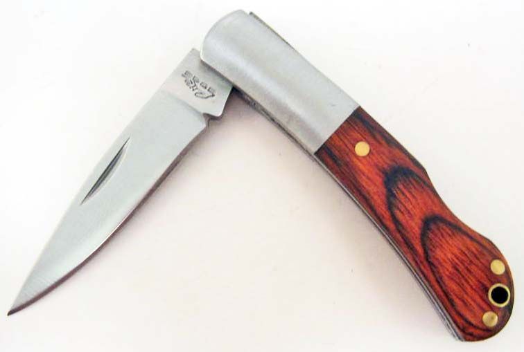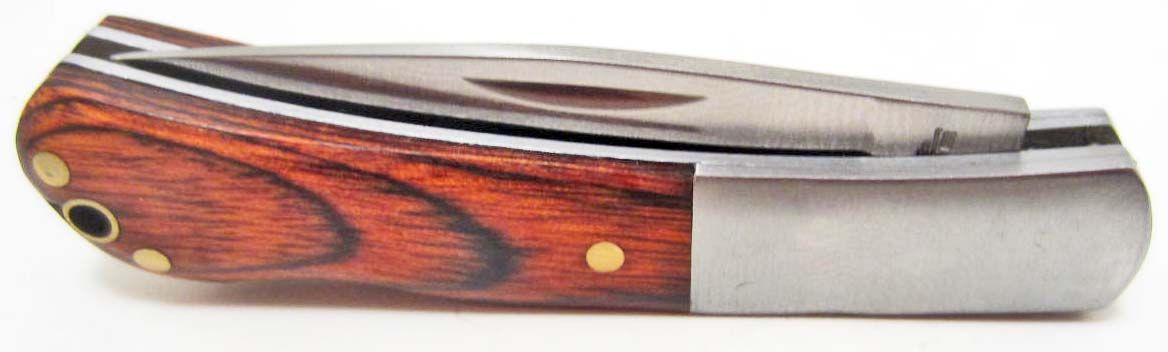 3 3/8" closed. Stainless drop point blade. Wood handles with brushed stainless bolster and lanyard hole.