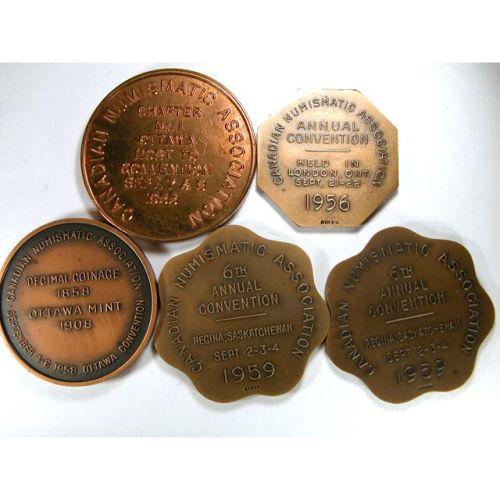 CNA Convention Medals: 1955, 1956, 1958 and 1959 two pieces. Five medals, all Uncirculated