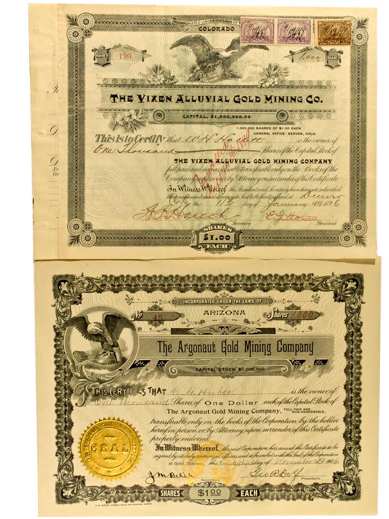 Lot of two stocks. 1) Vixen Alluvial Gold Mining Co. Measures 10¾’’x 8’’. Incorporated in Colorado. Cert. #199 issued to W.H. Hauett for 1000 shares on January 11, 1896. Signed by President E.J. Uarrser and Secretary A.P. Uarrser. Vignette of an eagle at top center. The eagle sits on a shield and arrows. Green border and black print, with embossed seal at lower left. Green safety print. Cancelled September 14, 1899. Cancellation marks show as red ink marks over the President and Secretary signatures, as well as the written date of cancellation in the center of the stock. Two fold creases form. Upper right corner is bent slightly. 2) Argonaut Gold Mining Company, measures 11’’x 8 ¼’’. Incorporated in Arizona. Cert. #45 issued to G.Huber for 1000 shares November 23, 1906. Signed by President W.R. Duef and Secretary G.M. Belish. Vignette of an eagle is in the upper left corner. A gold vignette of a woman is located in the bottom half on the stock. Black border and print. Gilt embossed seal and gold safety print. Two fold creases. Uncancelled.