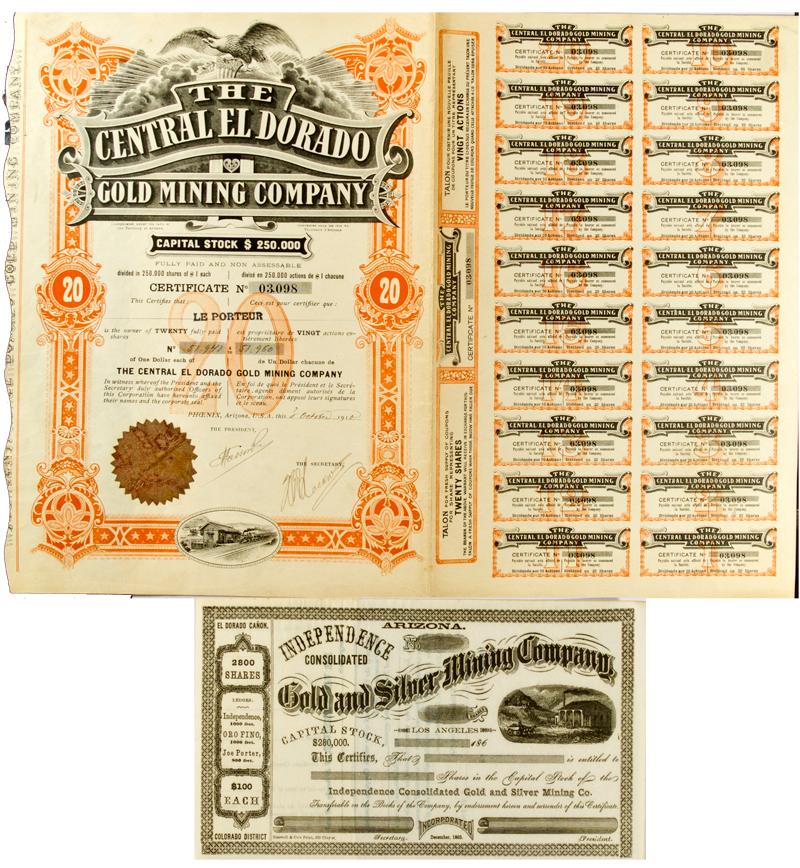 Lot of three items. 1-2) Independence Consolidated Gold and Silver Mining Company Stock Certificates. Incorporated in Arizona, December, 1863. Datelined Los Angles, 186_. Printed along left border from top to bottom: "El Dorado Canon, 2800 Shares, Ledges: Independence, 1000 feet. ORO FINO, 1000 feet. Joe Porter, 800 feet. Colorado District. Vignette of mill, ore cart, and horse-drawn wagon at center right. Buswell & Co's Print, 509 Clay St. 3) The Central El Dorado Gold Mining Company, incorporated under the laws of the Territory of Arizona. Certificate No. 03,098 issued to Le Porteur for 20 shares. Datelined Phoenix, Arizona, U.S.A. on October 3, 1910. Signed by (illegible as The Pesident and The Secretary). Large Vignette of eagle holding stars and stripes shield over breaking clouds and ornate company name. Ornate orange border, black print, and brown embossed seal at lower left. Twenty dividend coupon still attached. Piece is written in English on the left side and French on the right on front and back.