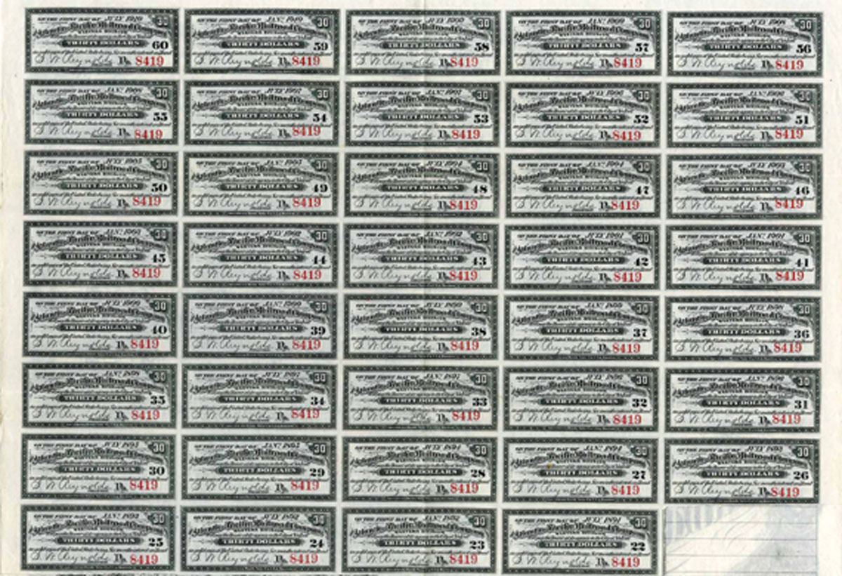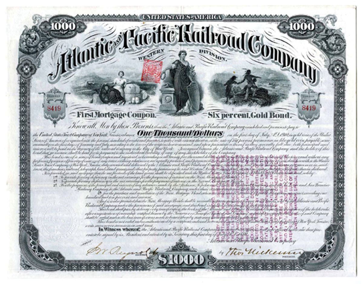Issued and Uncancelled $1000, 1st Mortgage 6% Gold Coupon Bond, I/U # 8419, Allegorical women and Natives vignettes, Company seal, Coupons attached, VF-XF, ABNC.