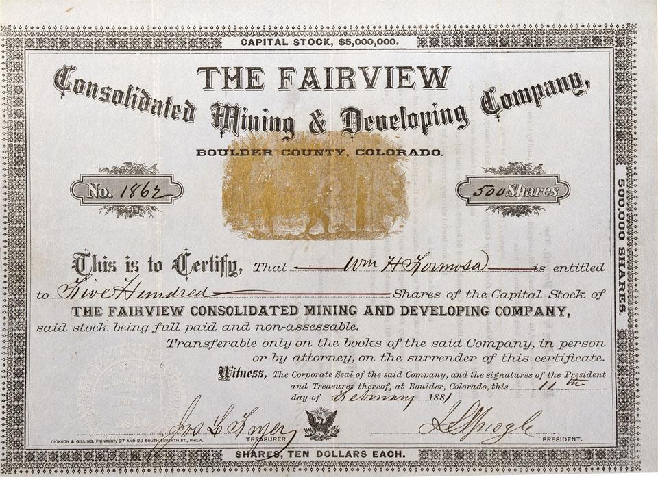 No. 1862 issued to Wm. H. Formosa by Jos. L. Fayer, Treasurer, and L. S. Spiogle (?), President, on February 11 for 500 shares. Not listed in the 1883 Colorado Mining Directory. Signed on the reverse by Formosa and witness but not dated. U/C. Excellent condition.