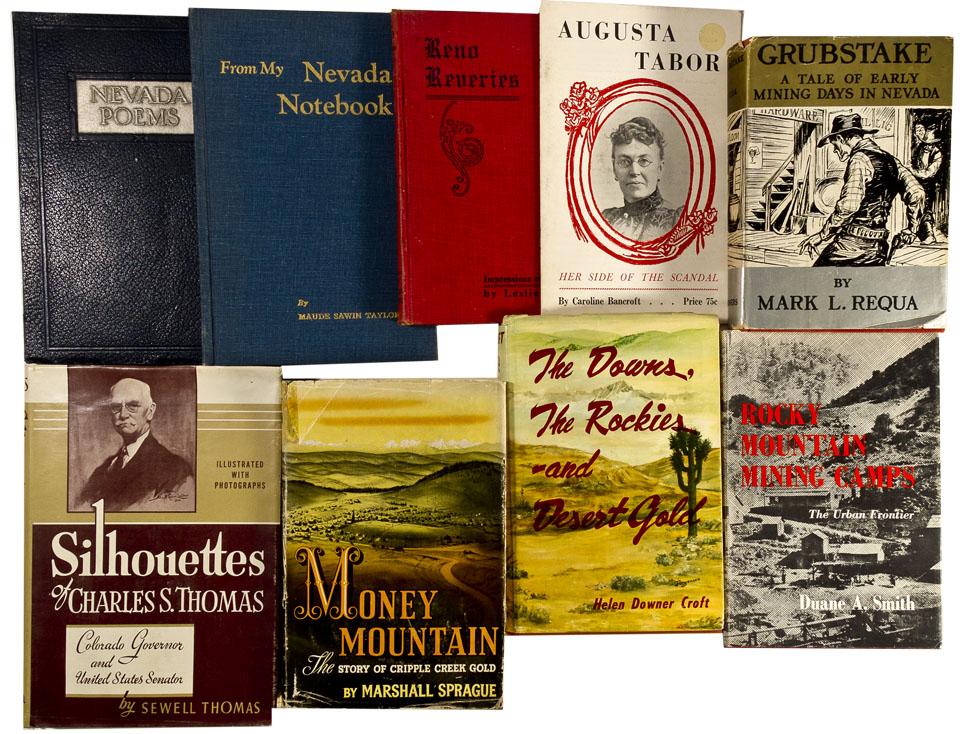8 books and 1 pamphlet with stories of Colorado and Nevada. 1) Bancroft, Caroline. Augusta Tabor: Her Side of the Scandal. 5th ed, 1958. (pamphlet). 2) Croft, Helen Downer. The Downs, the Rockies and Desert Gold. 1961. 3) Smith, Duane A. Rocky Mountain Mining Camps. 1967. 4) Sprague, Marshall. Money Mountain: The Story of Cripple Creek Gold. 1953. 5) Thomas, Sewell. Silhouettes of Charles S. Thomas. 1959. 6) Book of Nevada Poems. Edited by the Nevada Federation of Women’s Clubs. 1927. 7) Curtis, Leslie. Reno Reveries. 1912. 8) Requa, Mark L. Grubstake: A Tale of Early Mining Days in Nevada. 1933. 9) Taylor, Maude Sawin. From My Nevada Notebook. 1965.