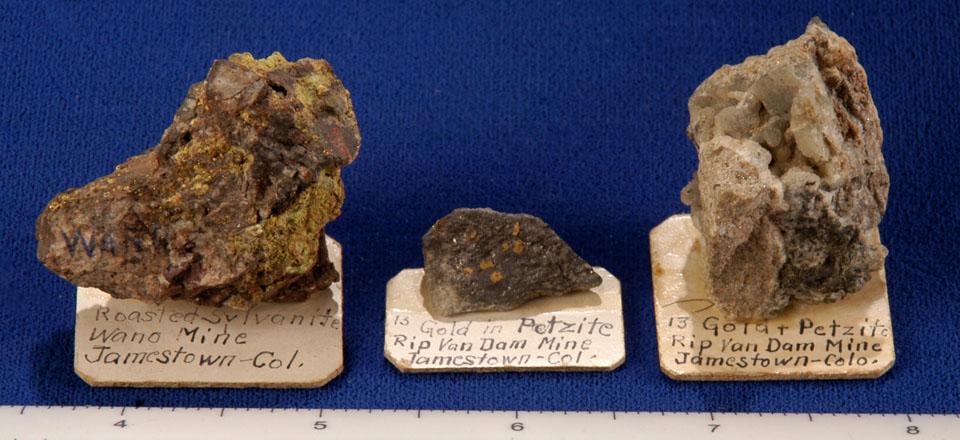 Lot of 3. 1. One-half cubic inches gold in Petzite, Rip van Dam Mine. 2. 103 cubic inches Roasted Sylvanite, Wano Mine. 3. 1-3 cubic inches gold and Petzite, Rip van Dam Mine0