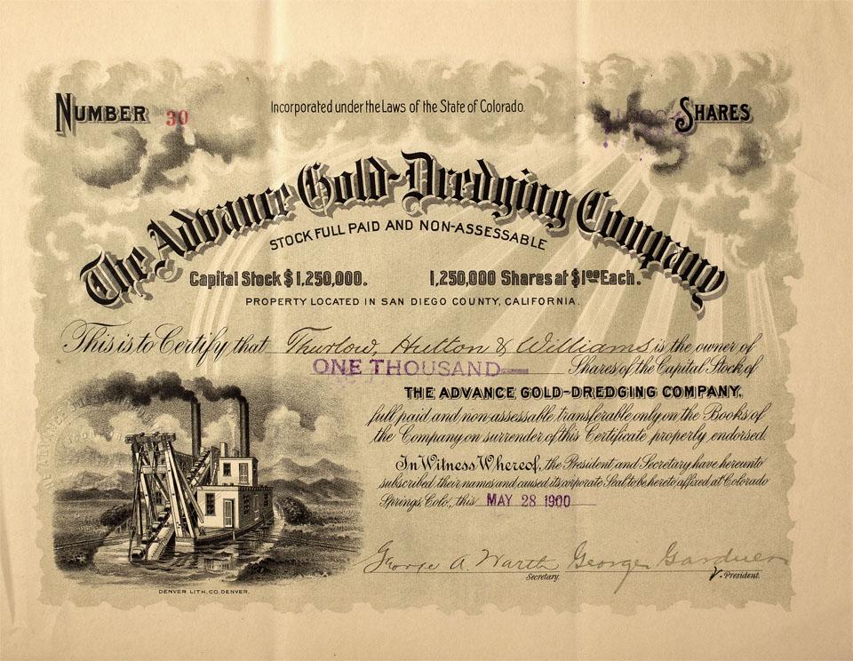 No. 30 issued May 28, 1900 to Thurlow, Hutton & Williams for 1000 shares. Signed by George Warth, secretary., and George Gardner, Pres. Fancy litho vignette of the mill in operation. Printed by Denver Lith. Co, Denver, Co. Rare. 10 3/4" x 8 1/2".