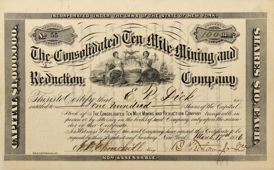 Incorporated in New York in 1885.  Ten Mile Mining District.  No. 55 issued to E. R. Dick by A. D. Churchill, Secretary, and B. Thuham Jr., Vice President, on 17 March for 100 shares.  A smaller-sized stock.  Signed by Edward R. Dick on reverse and Geo. Rogers, as witness but not dated.  Kokomo was the main camp of this district, which was located “in the southwest corner of Summit Co. . . .  The mine was a minor silver producer until after 1900, when lead-zinc production became important” [Ref:  Holabird, The Alexandra Tillson Filer Collection, Part II:  Colorado, Nevada, Montana and the Hauser Collection of Anaconda Corporate Seals, p. 139, 2000].