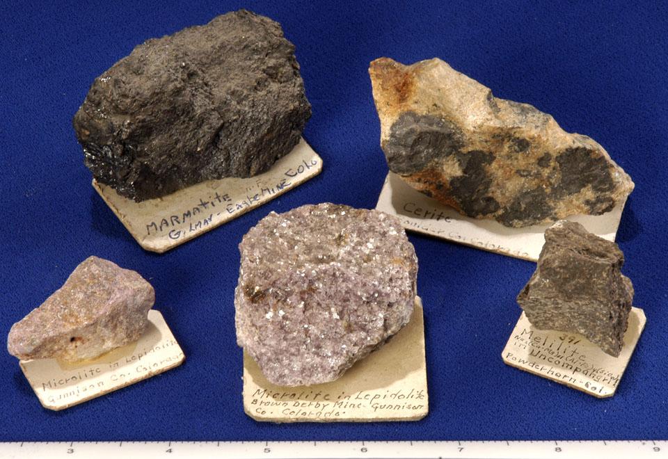 Lot of 11 specimens from various locations in Colorado including Gilman, Caribou, Dove Creek, Powderhorn, Turkey Creek, and Boulder. Samples include pectolite, microlite, lepidolite, marmatite, cerite, uraninite, argentite, melilite, bismuthinite, chalcopyrite, and zippeite. Sizes range from 4 x 2 cm to 7 x 5 cm.