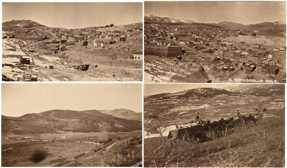 Lot of 4. 1) Photo measures 5 3/8" x 3". A landscape view of Nevadaville city. Fairly small and deserted town with dirt roads and snow all over the ground to the left of the photograph. One mountain is seen in the background. At the bottom right of the photo is "1 Nevadaville Colo." which means that this photograph may have been part of a series at one point. Fine focus, medium contrast. 2) Measures 5 3/8" x 3 1/8". A birds eye view of late Nevadaville. Two railroads, and only about 6 to ten buildings can be seen. Various mountains, trees, and open spacious land surrounding. Somewhat washed out background, medium contrast. Good. 3) Closer landscape view of the town. Various buildings, all of them having similar shape and size, all down the sides of a main road. "3 Nevadaville Colo." is printed to the bottom right hand corner, indicating this photo may have been a part of the first photo's series. Great focus with medium contrast, good overall condition. 4) Measures 5 1/4" x 3 1/8". Photograph of two men, one riding a horse, and the other riding on a horse drawn wagon. Two or more rows of horses walking together in the same direction. Open desert land, with only three or so buildings seen in the distance. Photo was taken at an angle, as the horses and two men are headed up hill. Small patches of snow are seen throughout the background. Medium contrast and focus. Good overall condition. All photographs have no tears, folds, or stains, with unverified photographers. All are "glued" down onto a black sheet of construction paper.