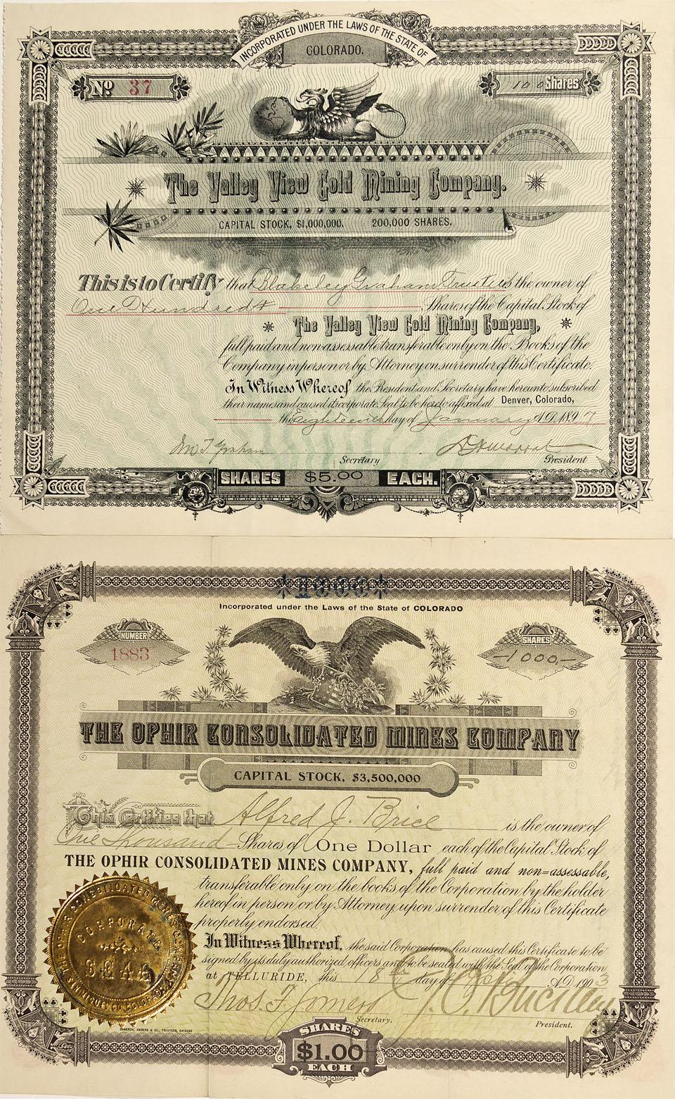 2. The Valley View Gold Mining Company. David Halliday Moffat (1839-1911), a Colorado businessman, and President of this gold mining company, came to Denver in 1860 and opened a book store with C.C. Woolworth. He was one of the largest mine operators in Colorado. He had numerous investments in mining properties with Jerome B. Chaffee and Horace Austin Tabor, including the Little Pittsburg Consolidated Mining Company at Leadville. Moffat was also involved in many railroad enterprises. Moffat long dreamed of building a railroad through the mountains from Denver to Salt Lake City. He did not live to see the completion of this project, but, although high operating costs initially caused severe financial difficulties, the famous Moffat Tunnel through the Continental Divide, finished in 1928, eliminated the greatest problems [Carl Swift]. This stock, number 37, was issued to Blakeley Graham Trustee by J. T. Graham, Secretary, and D. W. Moffat, President on 18 January 1897. Signed on reverse by Blakeley Graham Trustee. On crème paper that fades to green with a black border. There are flowers at each corner. Vignette of a griffin holding the globe is over the company masthead. Not cancelU/Cnt condition.