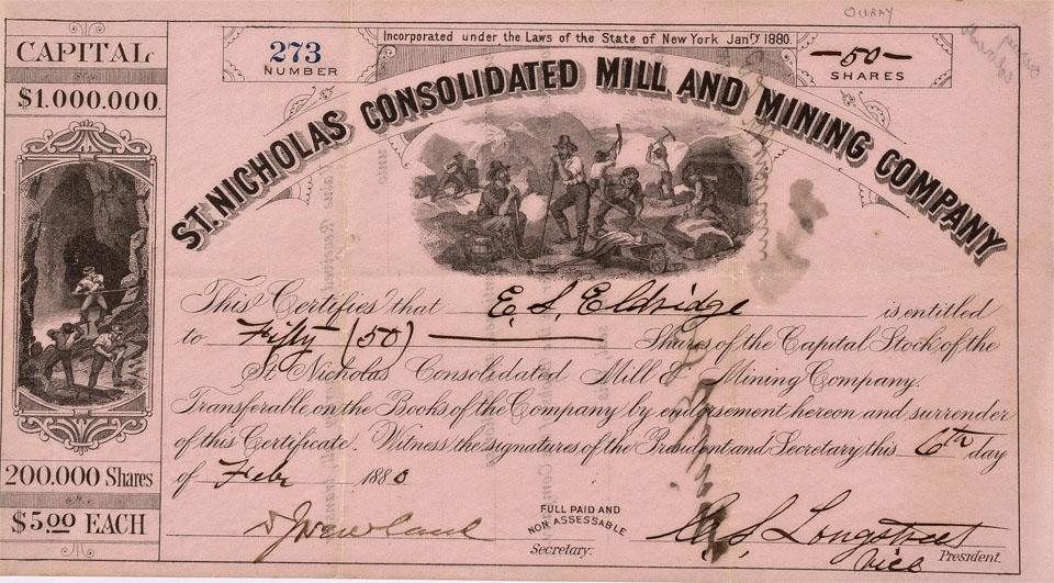CO - Ouray,February 6, 1880 - St. Nicholas Consolidated Mill and Mining Company, Stock Certificate