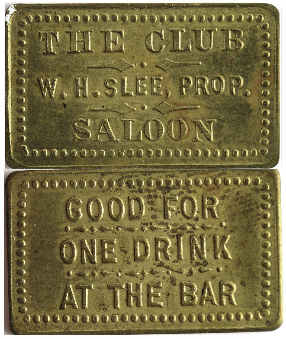 A rare rectangular saloon token. W.H. Slee was the proprietor of the Walden Club Saloon.