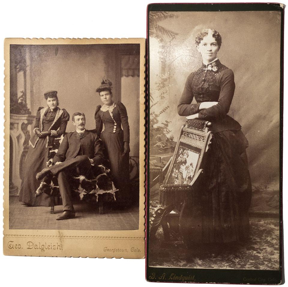 Lot of 3 cabinet cards. 1) Photo measures 3 3/4" x 5 2/8", mounted on a tan scalloped matte that measures 4 1/8" x 6 1/4". A man in a three-piece, pin-striped suit, sits on an animal print fabric layed over a chair, with his leg crossed over. Two women stand behind him, each with one arm resting across the back of the chair. They are both dressed very well in floor length gowns. Medium contrast, and good focus. Photographed by Geo. Dalgleish in Georgetown, Colorado. Dalgleish operated there from 1890 through 1901 according to Carl Mautz. 2) Measures 3 5/8" x 7 3/8", mounted on a dark green and maroon colored matte that measures 3 7/8" x 8". A woman stands with perfect posture with her arms crossed and rested along the back of an exceptionally beautiful decorated chair. Medium contrast, good focus. Photographed by B.A. Lindquist in Central City, Colorado. 3) Measures 3 7/8" x 5 3/8", mounted on a white matte that measures 4 1/4" x 6 1/2". A young girl in an all white knee length dress, veil, crown and candle in her right hand, as she gracfully sits on a chair. May have been a baptism day or first communion? High contrast, great focus. Photographed by P. Carlson in Leadville, Colorado.