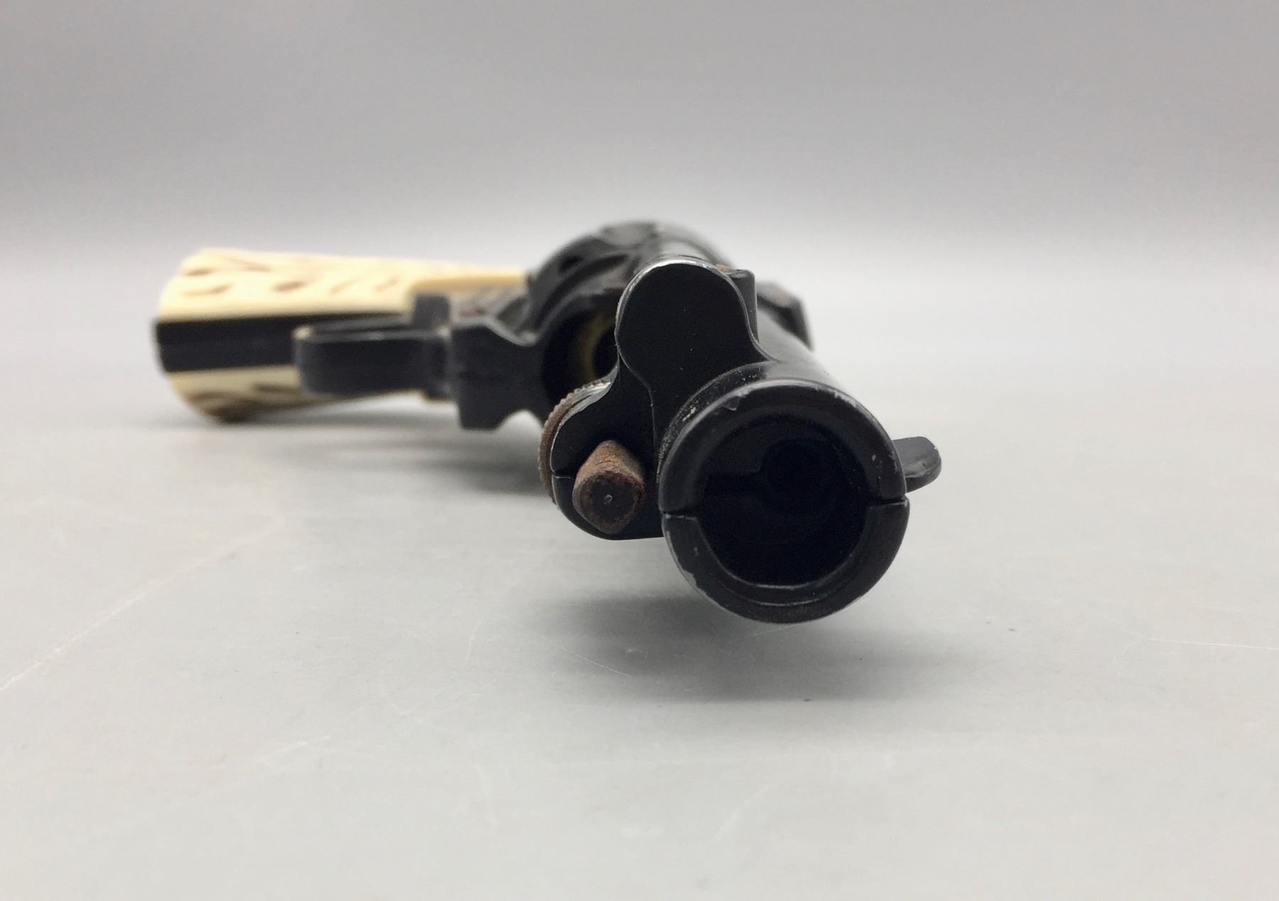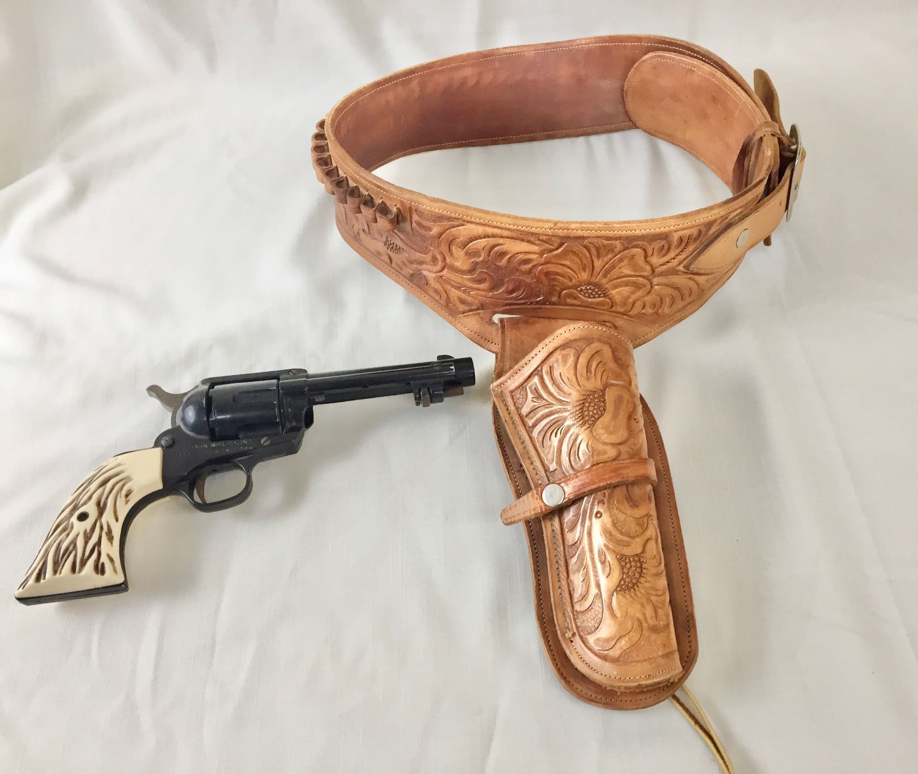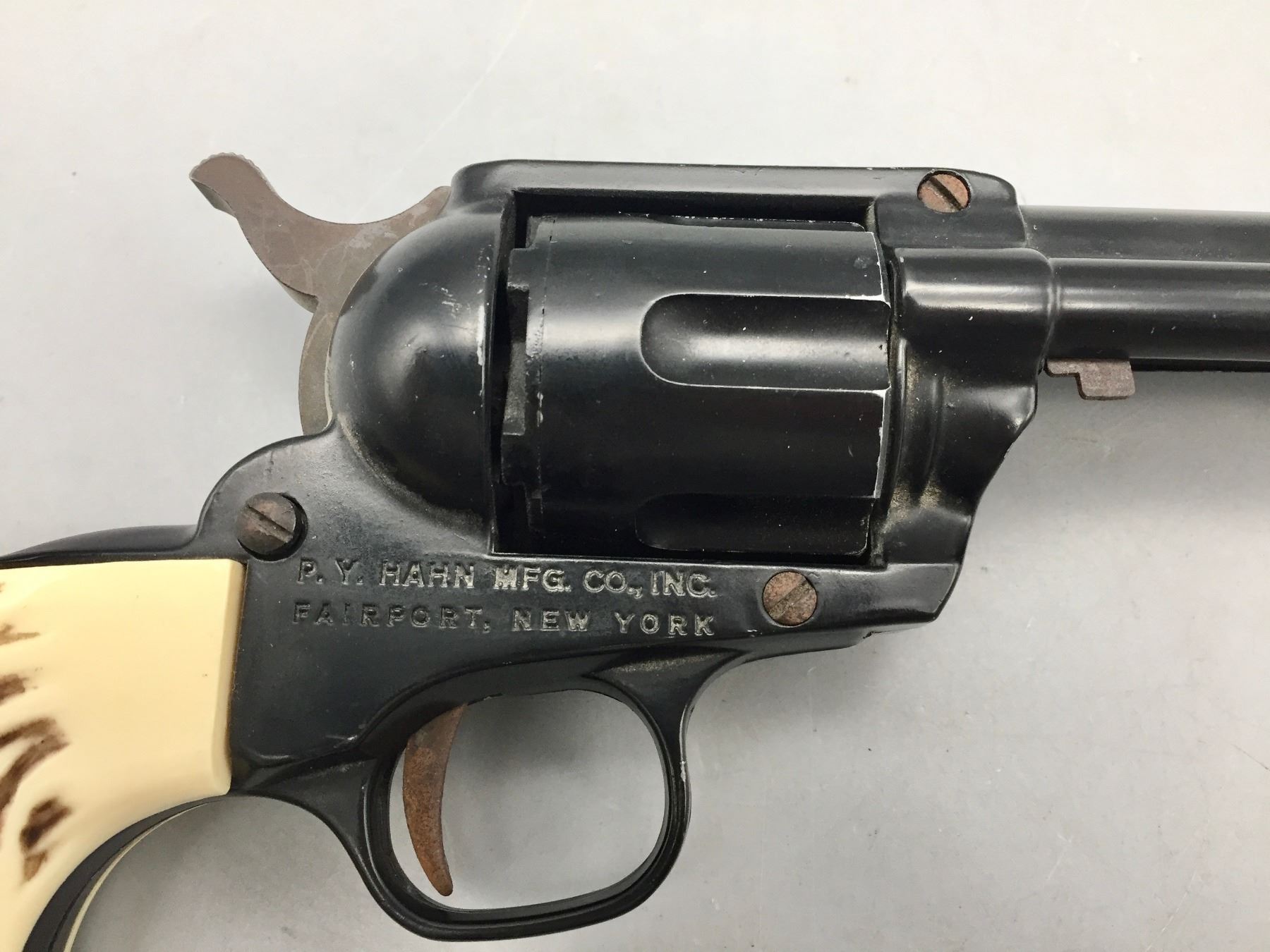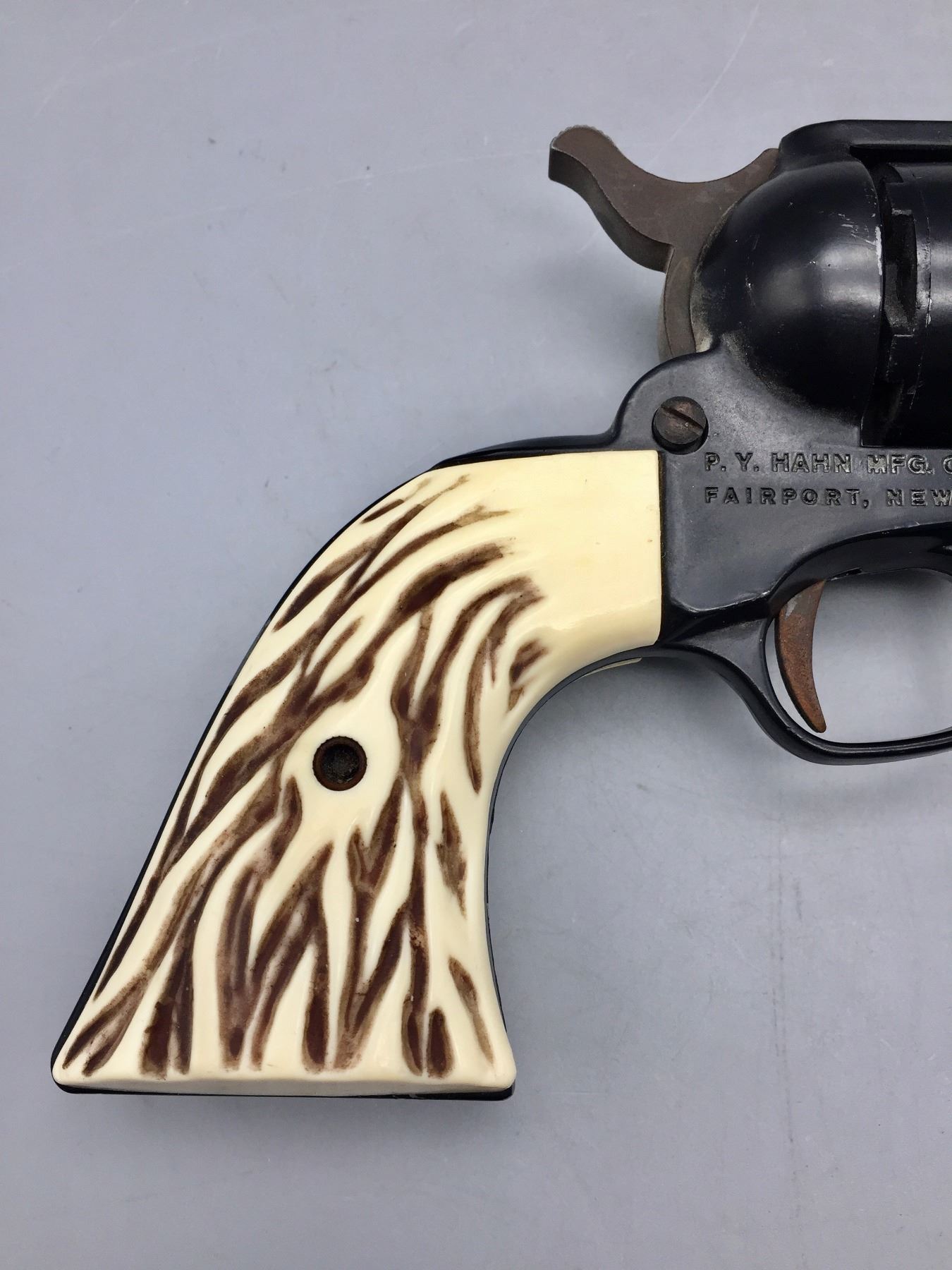 Description: For your enjoyment we offer for sale this authentic replica of the West’s Famous Peacemaker, A Hahn “45” BB Single Action Revolver that includes a very nice leather tooled holster. Maker: P.Y. Hahn Mfg. Co., Inc., Fairport, New York Approx. Age: Vintage. Size: Barrel measure 4-3/4” with an overall length of 11-1/2”. Belt measures 41”. Condition: Good for their age, normal wear expected. Please note that the CO2 cartridge is missing on this item. Please look closely at the pictures - they are an important part of our description. Shipping: There will be a $8 handling / packaging fee for shipping this lot. The actual cost of postage will be added on top of that. **No FFL Required**