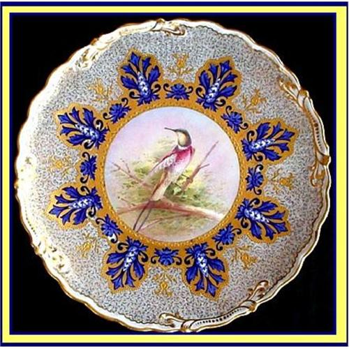 1 Coalport cabinet plate with handpainted bird painting, rich gilding and jewels. Made England 1880-1920.<BR>Measures 8 3/4inches in diameter.<BR>Wavy-edged gilded rim with moulded and gilded bows. Minutely detailed background pattern in green and gold. A golden ring with blue and white flowers and foliage alternating with raised gilded stylised plants and further embellished with tiny gold jewels. The inner golden circle has a double pattern of raised triangles. <BR>The central round reserve is painted with a beautiful double tailed, long beaked bird. Crimson chest. The light falls on the underside of his face and bottom of his tail, giving them a golden sunny look, which is echoed in part of the background. <BR>The plate is signed with the Coalport mark for 1881-1920 and has impress number 2JI. Further red handwritten numbers near the rim on the back.<BR>Condition is genrally very good.Painting and gilding are clear, unfaded and rich. Very close observation shows a fine glaze crack (magnified in the photos), but this does not compromise either the plate nor the painting.