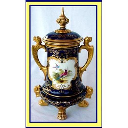 A Coalport pot and cover cobalt ground, handpainted with pheasants and flowers. England, 19th century. 10inches high. Bell shape, deep blue ground. Fabulously gilded lion mask handles. Rich neoclassical gilt decoration surrounding panels of birds & flowers. Suppported on lion paw feet. Lid with openwork and gilded finial. Great quality. Green Crown Mark England/Coalport/AD1750, painted pattern no 5146 over 200. Condition is excellent. A few very fine age cracks in gilding of feet.