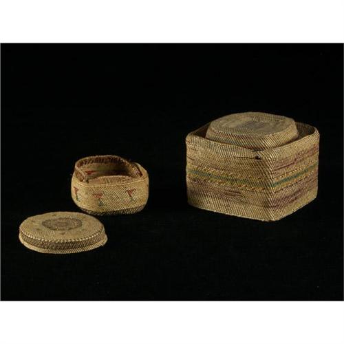 BASKETRY: Two Coastal Salish twined basketry items with lids. The first is a tea caddy-form basket with polychrome banding, 3.5''H x 5'' square, damage to form and body and fading noted. The second is a smaller cylindrical box with lid, polychrome banding and geometric design, 2''H x 4''W, damage to interior rim and fading noted.