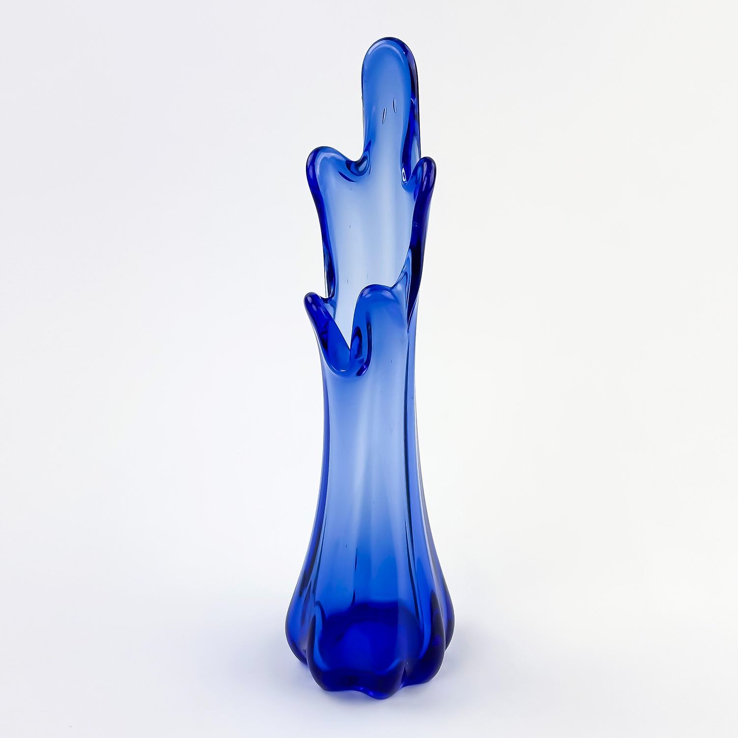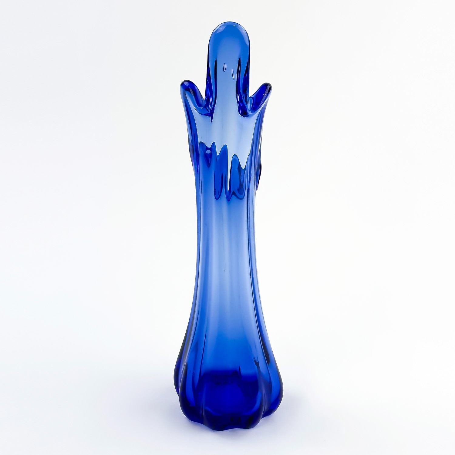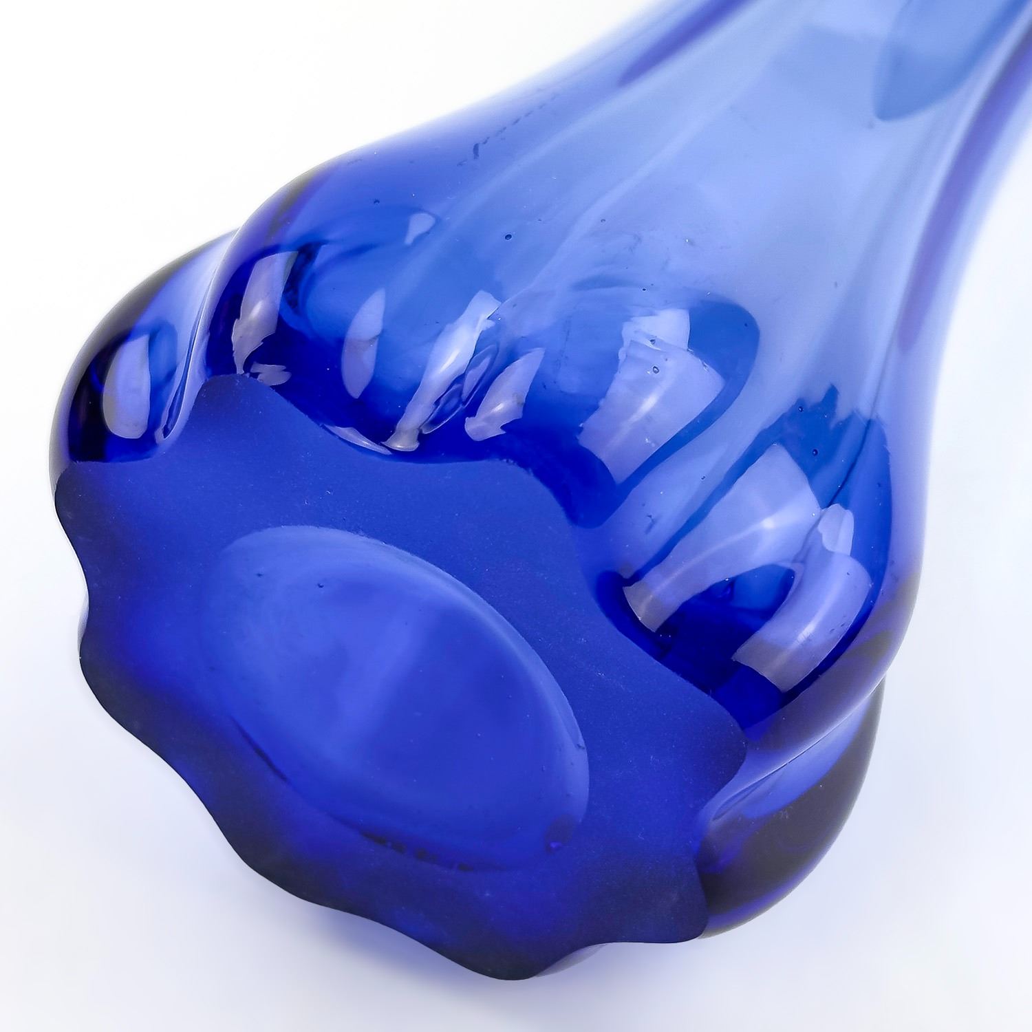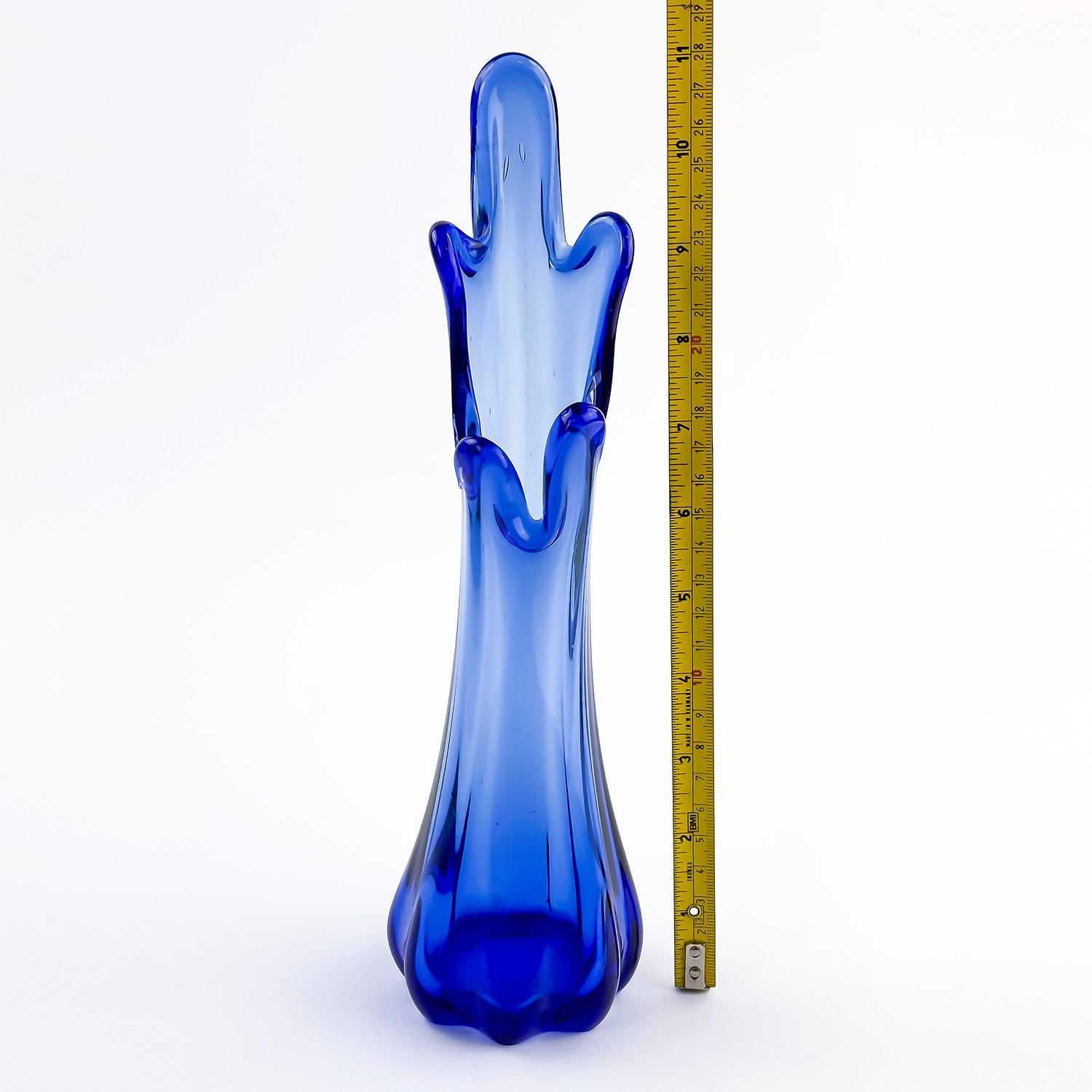 #8038 - VINTAGE COBALT BLUE STUDIO ART GLASS SWUNG VASE. UNMARKED - HAS SOME SMALL BUBBLES IN THE GLASS. HOME DECOR FLOWER OR BUD VASE. MEASURES: 11” (28 CM) TALL BY 3.125” (8 CM) DIAMETER BASE