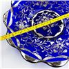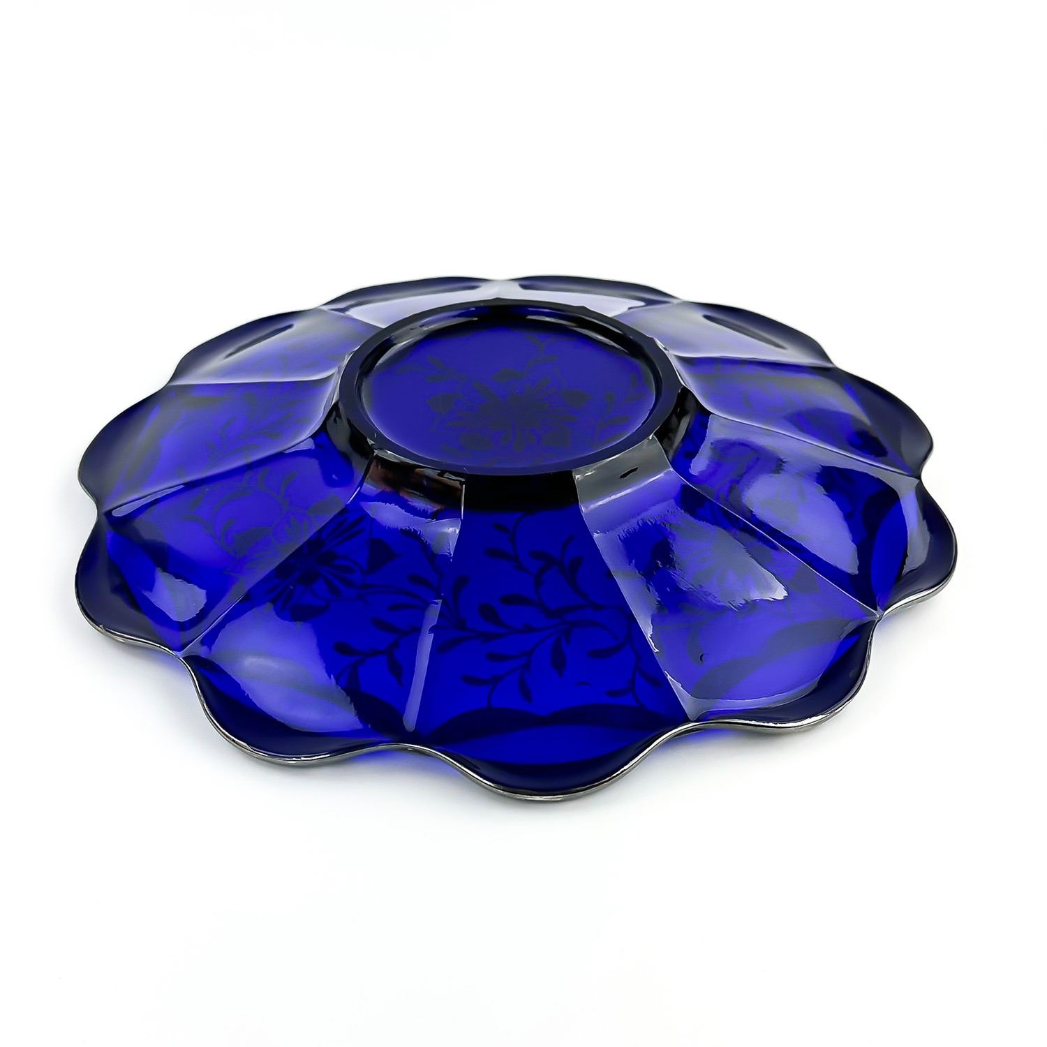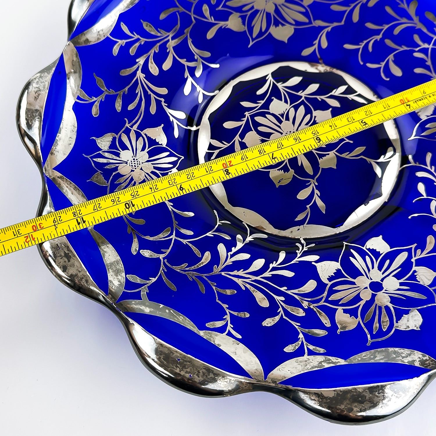 #8179 - VINTAGE ART DECO COBALT BLUE GLASS CENTERPIECE PLATTER, TRAY OR DISH. SCALLOPED EDGE PLATTER WITH SILVER OVERLAY. PLATTER IS IN A FOUND CONDITION WITH NO CRACKS, CHIPS OR REPAIRS. MEASURES: 12”(30.5 CM) IN DIAMETER AND SITS 1.75” (4.5 CM) HIGH