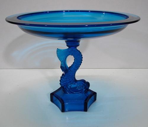 COBALT BLUE COMPOTE. Figural dolphin form stem. 8.25” H, 11” Dia.