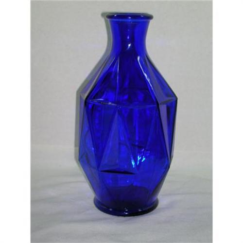 This is a great cobalt blue bottle with a modernist cubic design of opposing concave pyramids. The bottle is 8-1/2" tall and 4" wide. The bottom foot ring is 2-3/4" in diameter and has a ridged ring. This bottle would be a beautiful vase with flowers and also great for show in a sunny window. There are no chips, flakes or cracks.