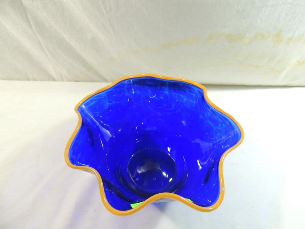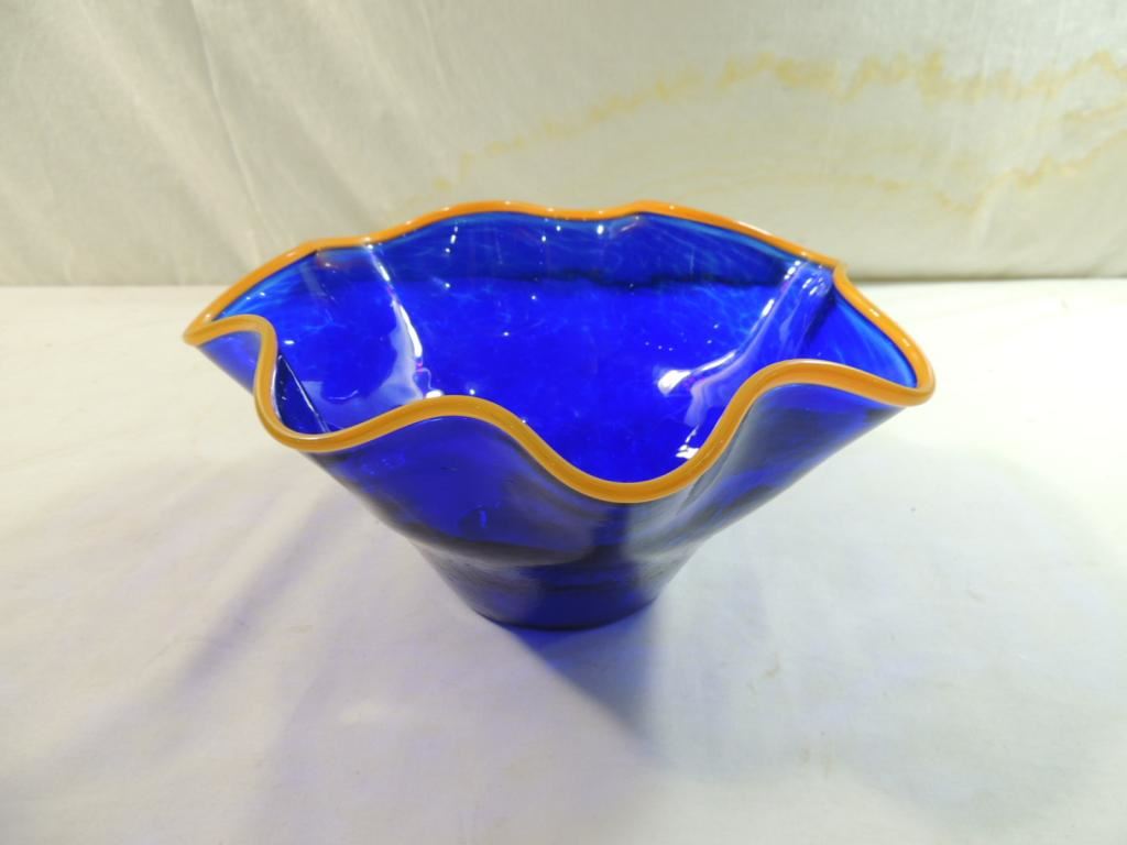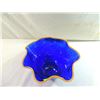 ORANGE EDGING VINTAGE SCALLUPED BLUE GLASS BOWL DECORATIVE BOWL AS SHOWN SEE PHOTO FOR MORE DETAILS.