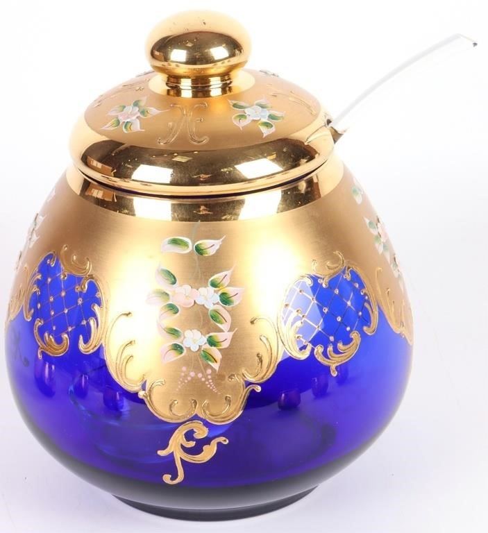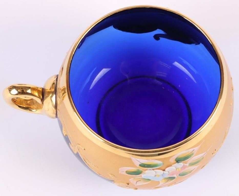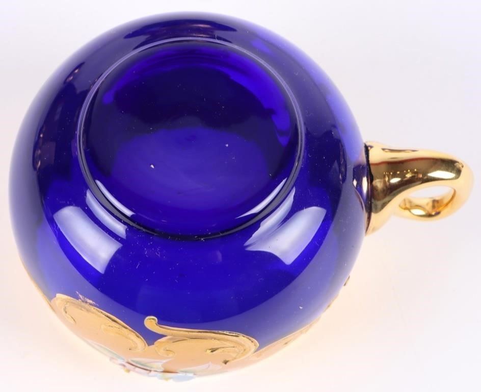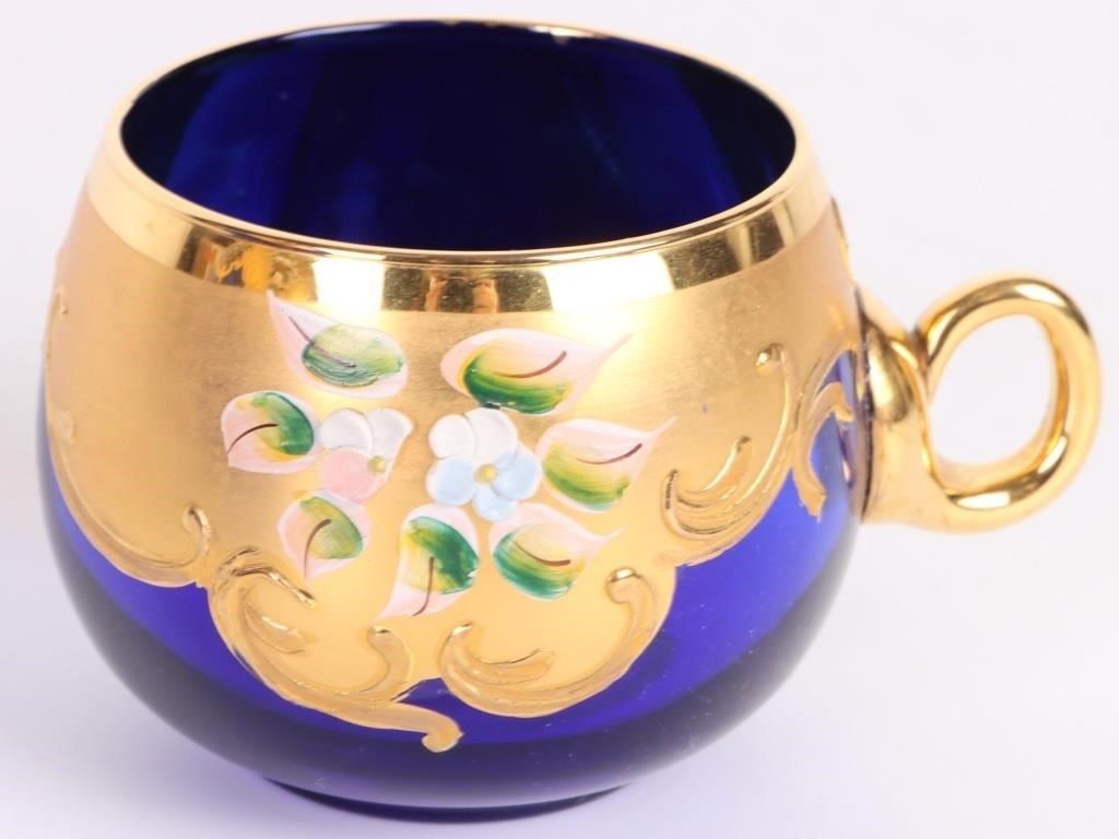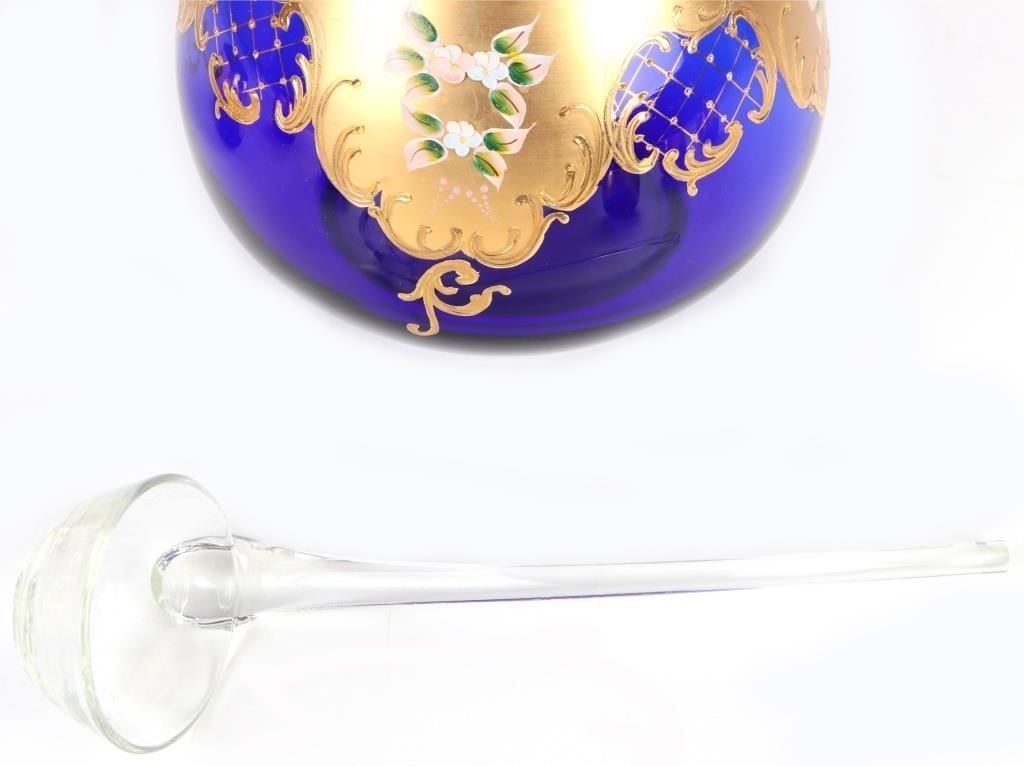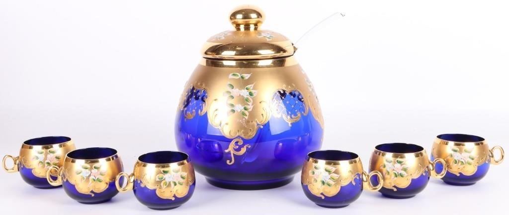 Cobalt Blue Italian Murano glass punchbowl set with gold trim and a floral motif. Set comes with six glasses one bowl and one clear ladle.