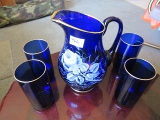 COBALT BLUE PITCHER WITH FLOWER DESIGN & 4 GLASSES