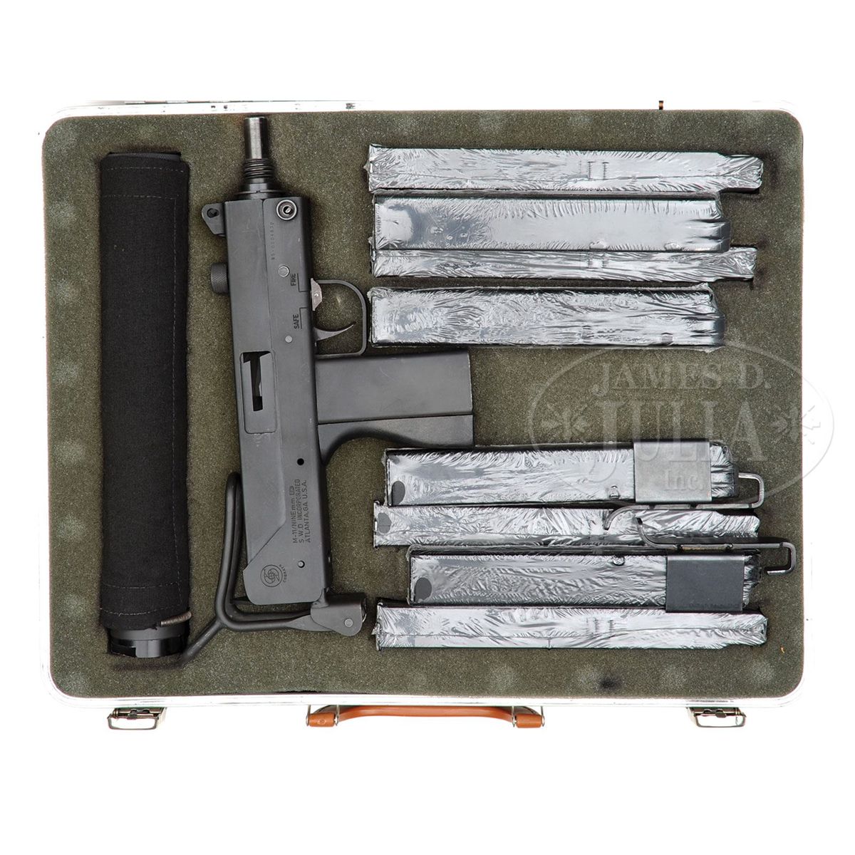 SN 85-0004832/N482. Cal 9mml, 5-1/2" bbl (15-1/2" w/ suppressor). Mac M11 open bolt select fire SMG. Collapsible top folding stock. Fixed rear peep sight, fixed front protected post sight, Parkerized finish. Includes 8 magazines (4-Cobray marked) all in shrunk wrap plastic and 2 magazine loaders with an operating manual in plastic hard case as well as a cloth sleeve which goes over the suppressor and held on by a spring at the muzzle side. Suppressor is marked "SWD INC ATL. GA." with Cobray logo and SN. Firing mechanism functions smoothly when operated by hand. This weapon appears fully functional. CONDITION: Overall finish & appearance extremely fine with only some slight brassing on the bbl to suppressor adapter. Also some slight loss of finish to safety switch which is very common on this arm. Bore is shiny & bright. Bolt face is excellent w/ evidence of firing. This gun holds well w/ the suppressor attached. 4-49728, 49729 JWK50
