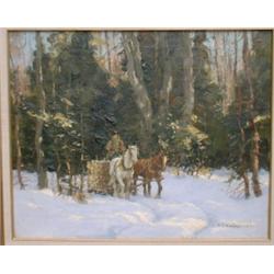 COBURN, Frederick Simpson, R.C.A., 1871-1960. "The Logging Team". Huile sur toile, signée et datée "26". Oil on canvas, signed and dated "26". 18" x 22" - 45.6cm x 55.8cm. $15000/25000