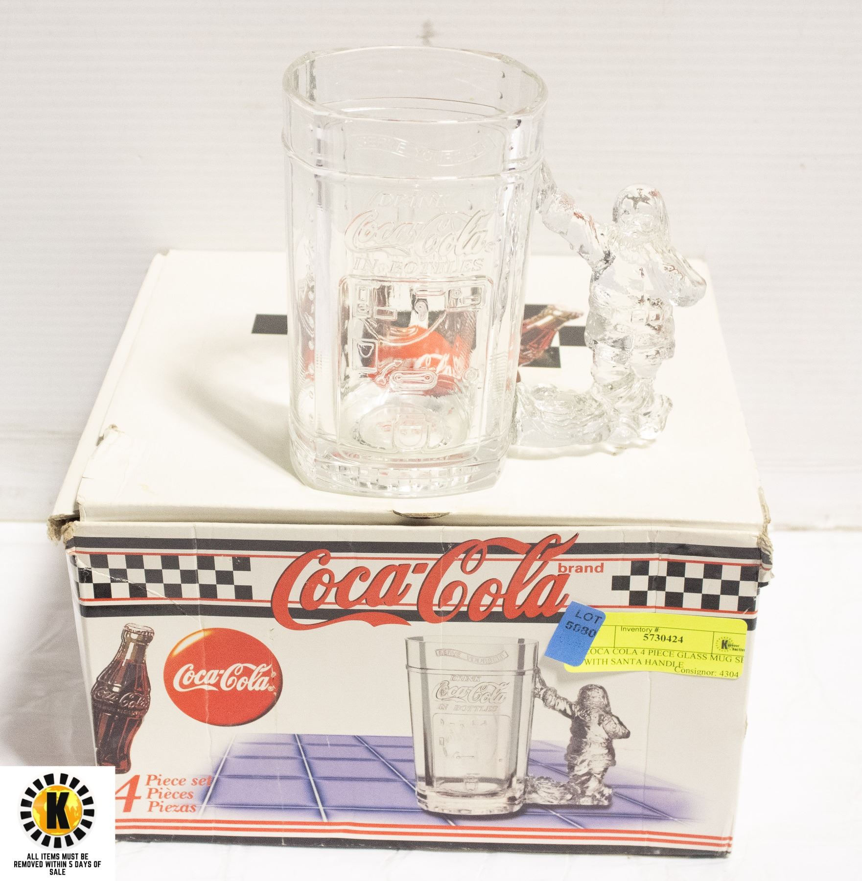 COCA COLA 4 PIECE GLASS MUG SET WITH SANTA HANDLE