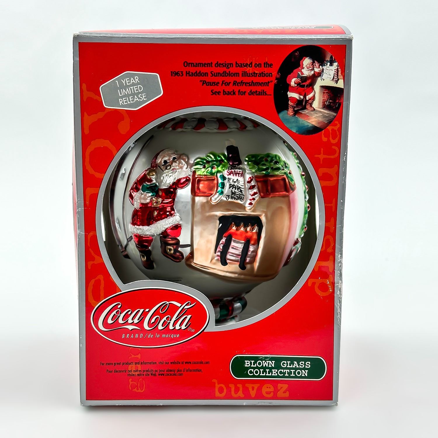#8977 - NEW IN BOX. ONE YEAR LIMITED RELEASE. COCA COLA HAND BLOWN GLASS “PAUSE FOR REFRESHMENTS” CHRISTMAS ORNAMENT. MEASURES APPROXIMATELY 4” (10 CM) DIAMETER***ITEM(S) LOCATED IN LETHBRIDGE ALBERTA. FREE TRANSPORT TO EDMONTON OFFICE AVAILABLE FOR THIS AUCTION. WORLDWIDE SHIPPING IS AVAILABLE FOR ALL ITEMS