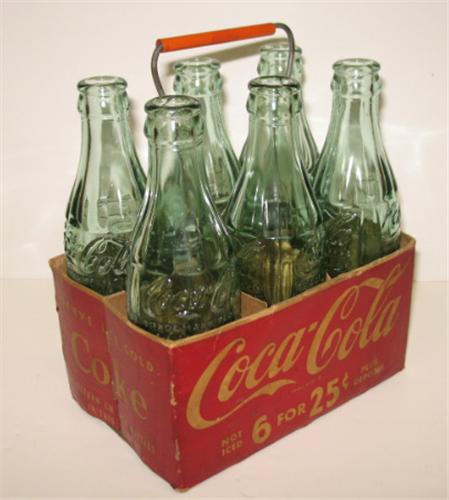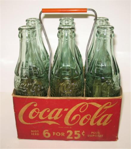 PAPER COCA-COLA BOTTLE CARRIER WITH SIX BOTTLES. Paper carrier shows signs of wear and minor damage.