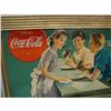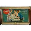 1942 COCA-COLA CARDBOARD SIGN IN GILDED WOODEN FRAME. Depicts a pair of gentlemen sitting at diner bar drinking Coca-Cola in bottles with waitress looking on. Text reads “A great drink with food”. Sign shows some crease marks at bottom. 20” x 36”.
