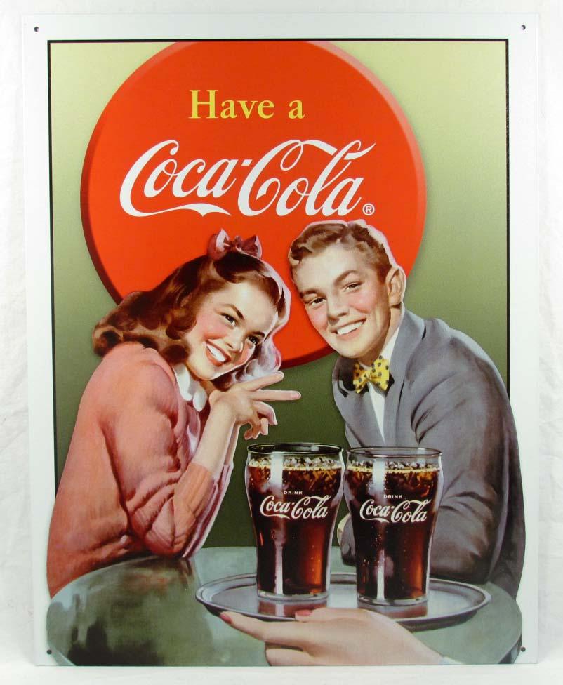 COCA COLA COUPLE METAL ADVERTISING SIGN - APPROX. 12.5" BY 16"