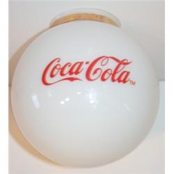 COCA-COLA LAMP SHADE. White glass. Globe form lamp shade for hanging light. Text reads “Coca-Cola”. Good overall condition. 6” H