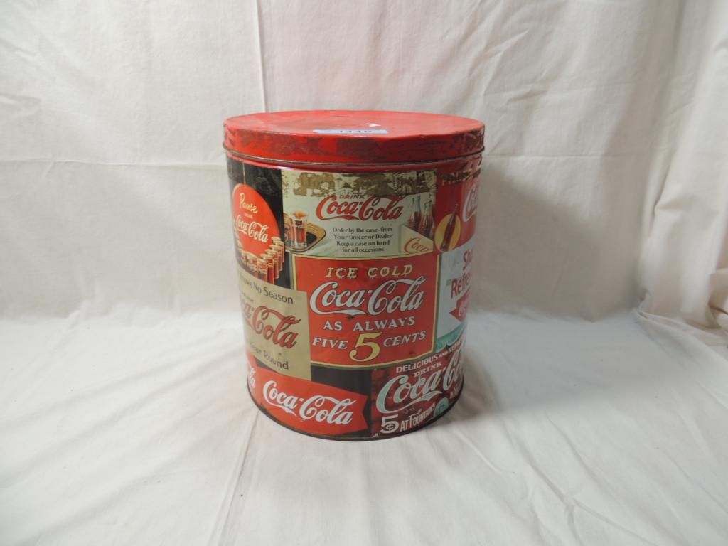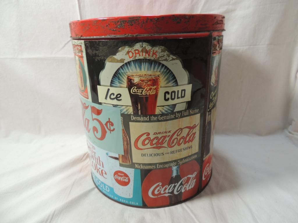 LARGE COCA COLA TIN CANNISTER THIS GREAT COLLECTIBLE COVERED WITH DOZENS OF OLD COKE ADS STANDS 11 INCHES TALL AND 10 INCHES IN DIAMETER. COCA COLA COLLECTIBLE. AS SHOWN. SEE PHOTO FOR MORE DETAILS