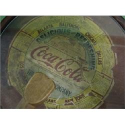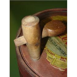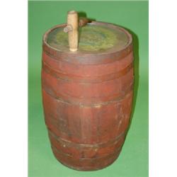 RED WASHED COCA-COLA SYRUP KEG. 10 gallon. Original label and spout. 26” H to top of spout, 12.5” Dia.