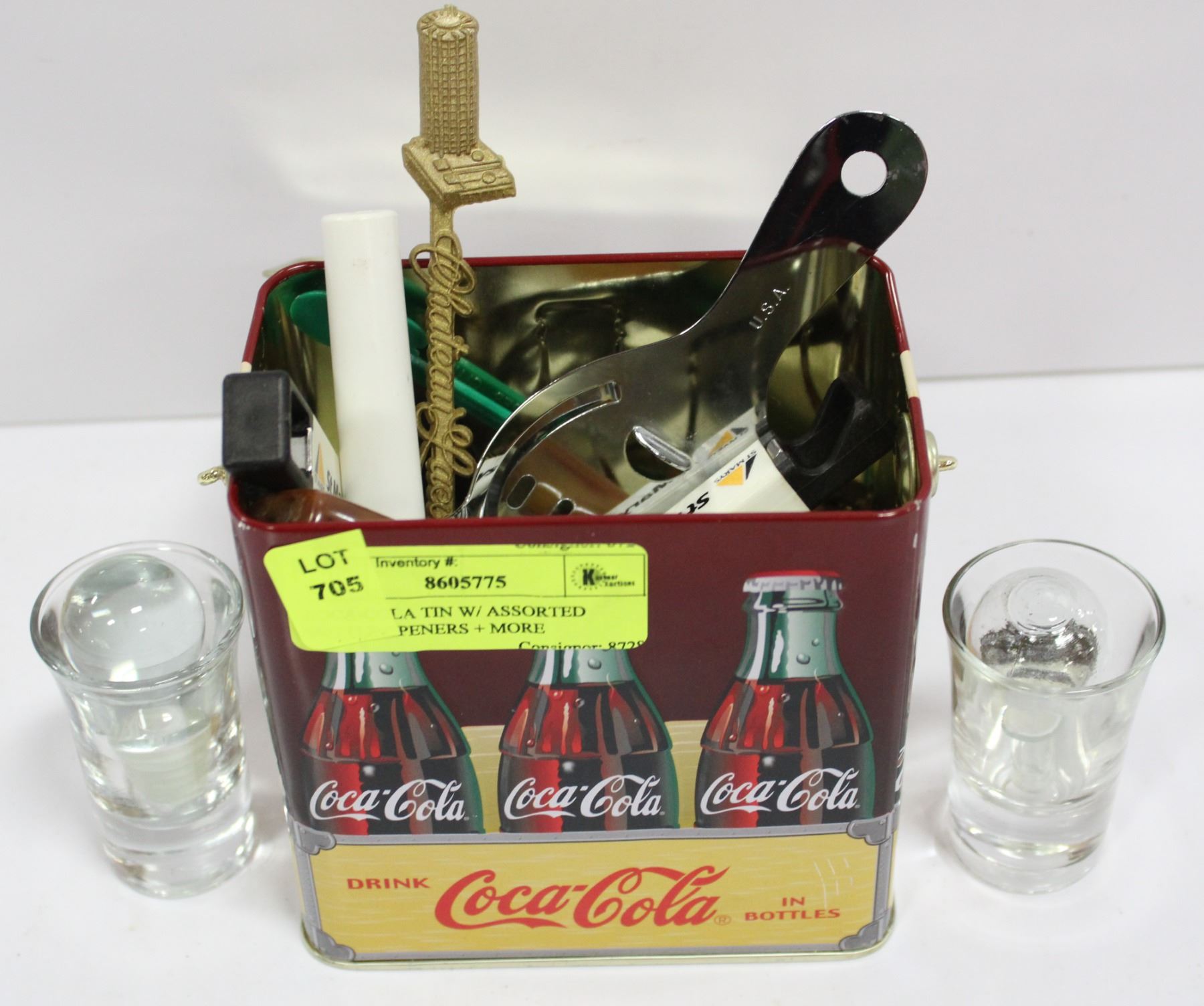 COCA-COLA TIN W/ ASSORTED BOTTLE OPENERS + MORE