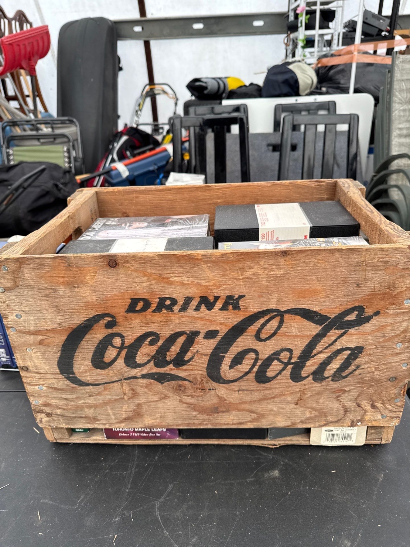COCA Cola bottle crate vintage with Dawn Cherry BHS's and silver anniversary collector's edition, VHSs, and various VHSs in box.