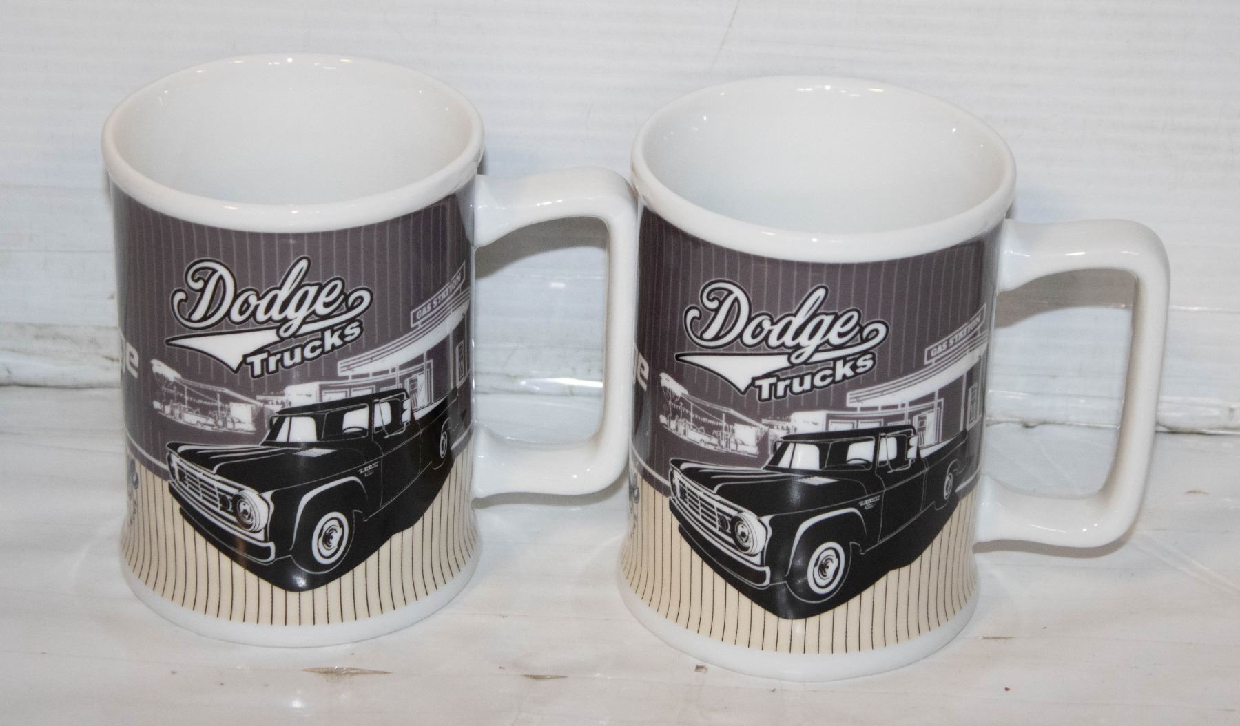 NEW IN BOX, 2 COFFEE MUGS, DODGE TRUCK MOTIF, DISHWASHER AND MICROWAVE SAFE, GIFT SET: VINTAGE CERAMIC AUTOMOTIVE COFFEE MUGS