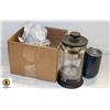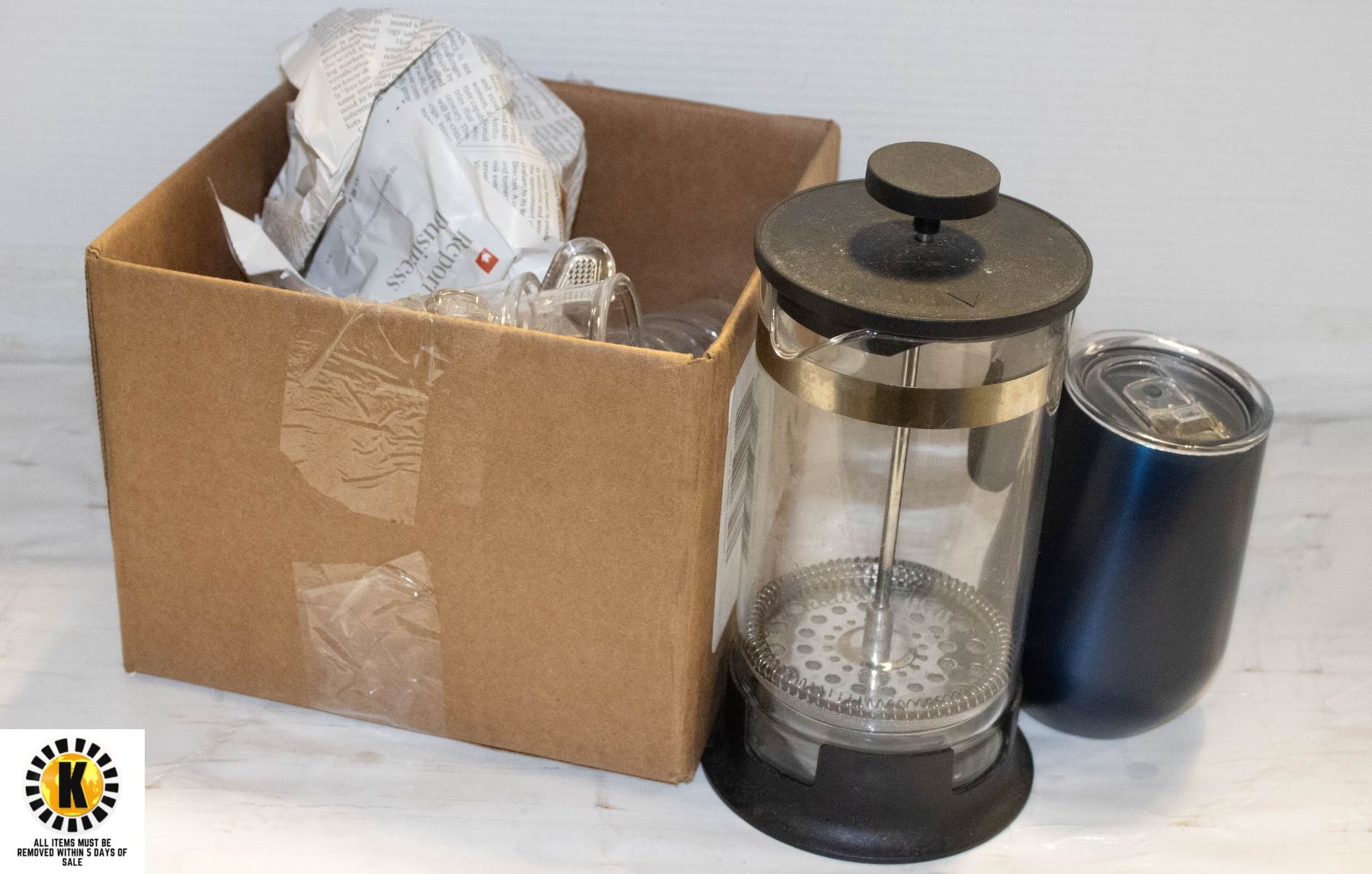COFFEE PRESS WITH TEA CUP AND SAUCERS,