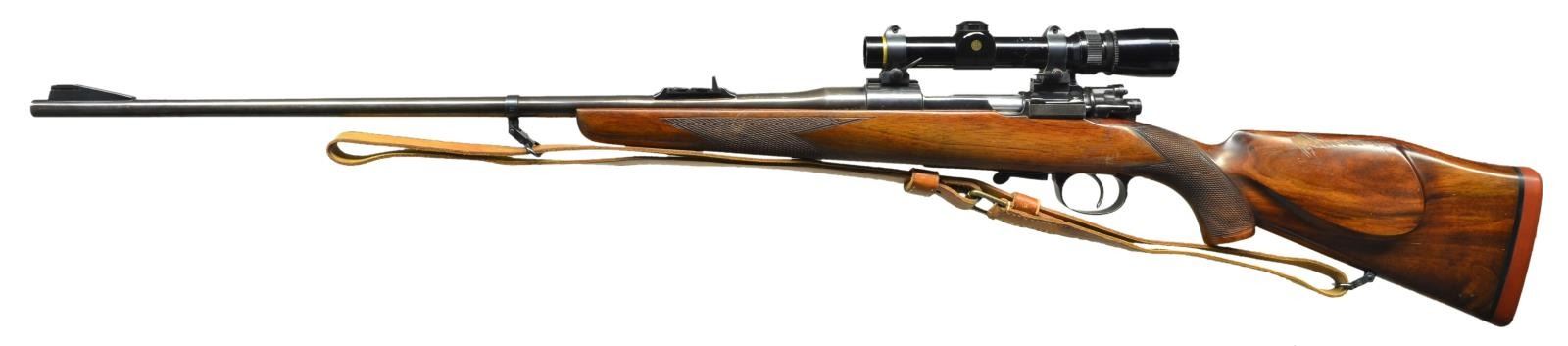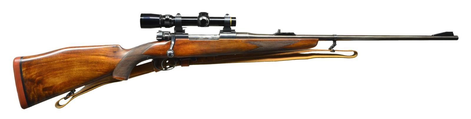 WITH SCOPE. Cal. 30-06 (consignor states). S# 69152 (CA 1955) (on trigger guard bow). The 26" tapered round barrel is fitted with one standing, two folding leaf express rear sight in island base and front ramp without bead. Top is marked with Cogswell & Harrison name and address. Model 98 Mauser action sourced from a military rifle has had markings removed and scope bases fitted. Bolt, with polished body has had handle lowered for scope use. Shroud is fitted with Buehler safety. Bottom metal has had floor plate altered to be hinged with large lever release. Stock of lightly figured European walnut measures 14 5/8" over "Old English" pad and features Monte Carlo comb, swept right hand cheek piece and flat top point pattern checkering at grip and forend. Rifle is fitted with 1.5-5X Leupold Vari-X III. Scope with duplex reticle in talley QD rings. CONDITION: fine as refinished, metal parts retaining most of their reblue, stock has many marks and scratches in its renewed oil finish, some marks are very heavy on left side above cheek piece. Bore is fine, action smooth, safety with not engage, rear sight is a replacement, scope is very good with some heavy marks on exterior, optically good. Rifle comes with brown leather sling in Jaeger QD loops. (22-5811/MGM). CURIO. $2,500-4,500.