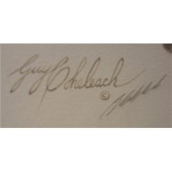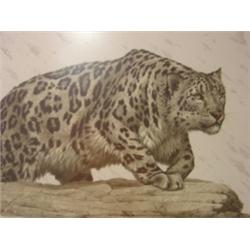 COHELEACH, GUY LYNX PRINT. Depicts spotted lynx on rocks. Signed in lower left. Frame shows small amount of damage. 36" x 30" framed & matted.
