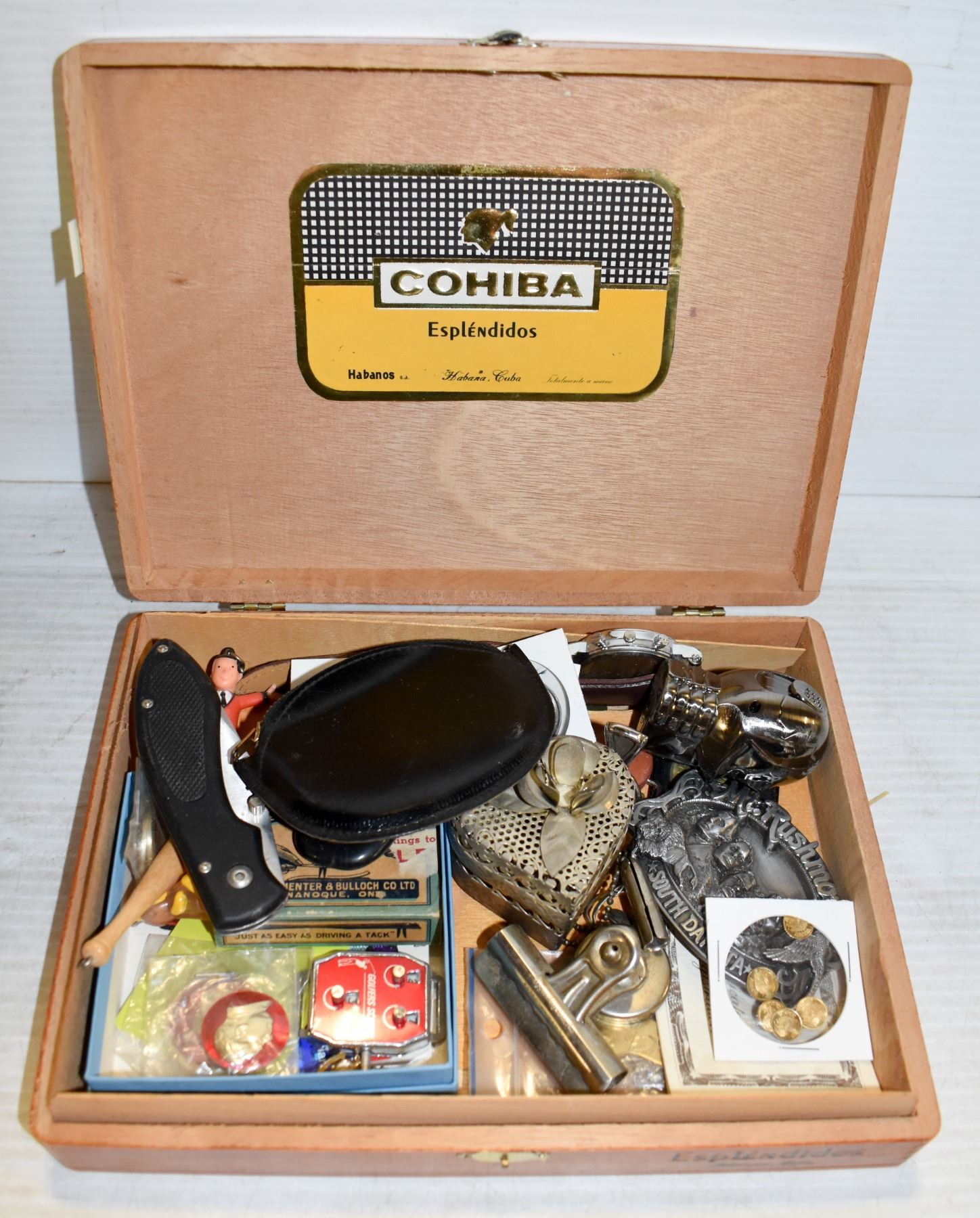 COHIBA BOX WITH COINS, KNIVES, COLLECTABLES ETC